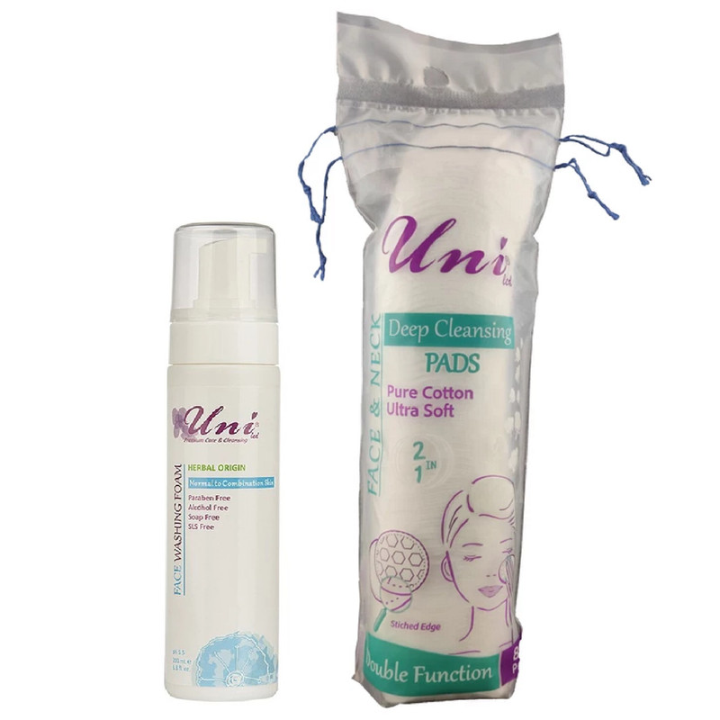فوم شستشوی صورت یونی لد مدل 02 مناسب برای پوست معمولی و ترکیبی حجم 200 میلی لیتر به همراه پد پاک کننده آرایش یونی لد بسته 80 عددی
