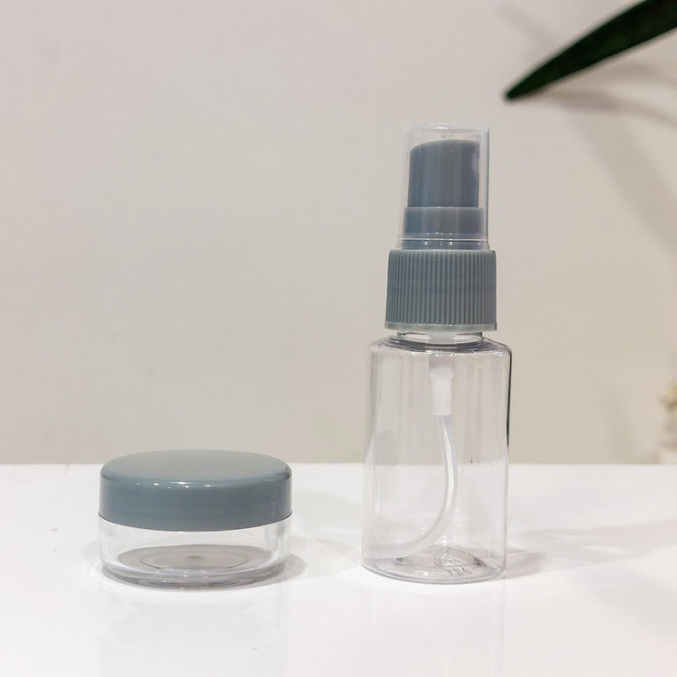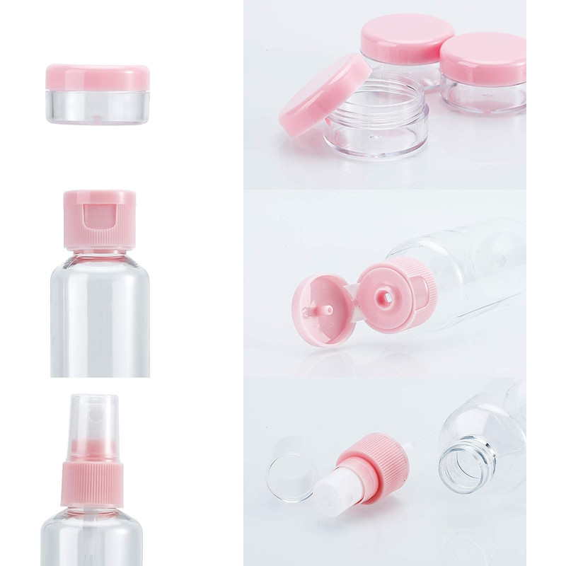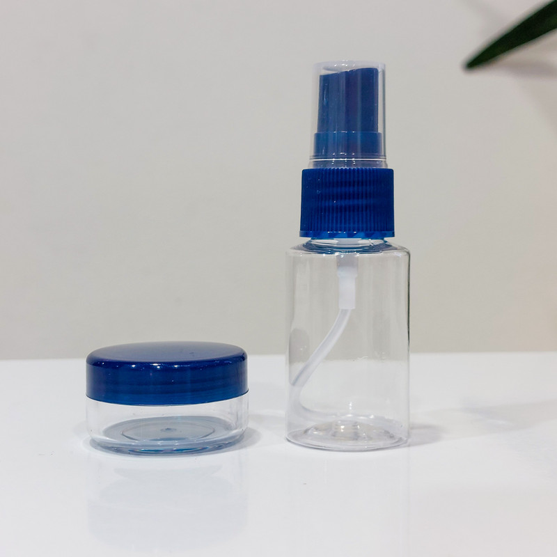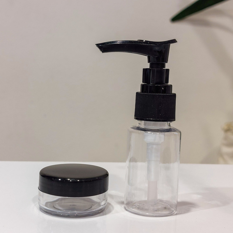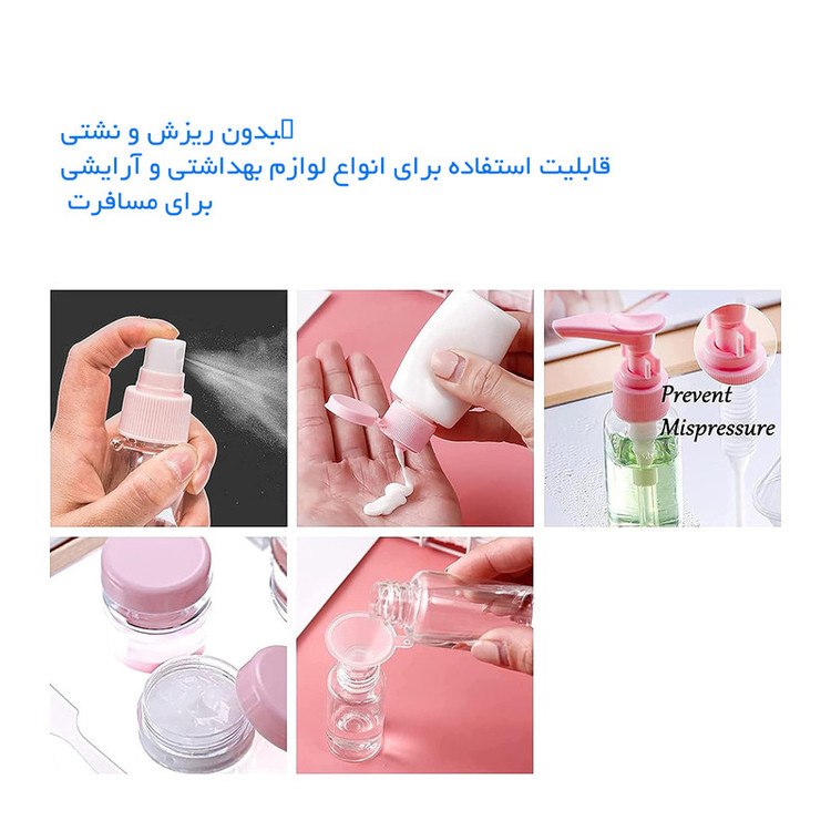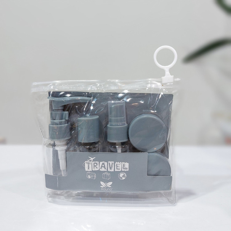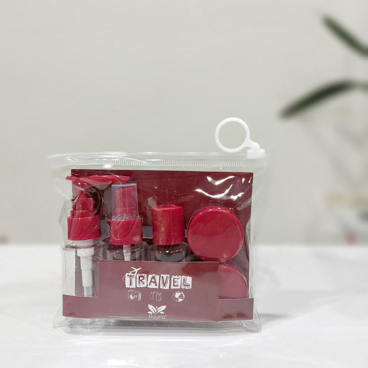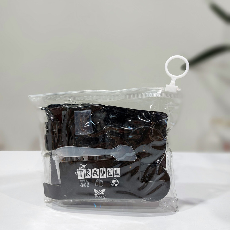 این پک 7تکهای شامل :یک عدد بطری پمپی مناسب محصولاتی مانند لوسیون بدن، ژل و..، یک بطری اسپری مناسب برای عطر،تونر،الکل،فیس میست و...یک عدد بطری در دکمه ای مناسب برای شامپو،صابون مایع، نرم کننده های و.. دو عدد ظرف در پیچی مناسب برای کرم های دست، ماسک مو و.. و یک کاردک که برای ریختن کرم و لوسیون ها به داخل بطری ها مورد استفاده قرار میگیرد، که در یک عدد کیف پلاستیکی شفاف با کیفیت زیپ دار برای حمل و نگهداری بطری ها قرار گرفته است.