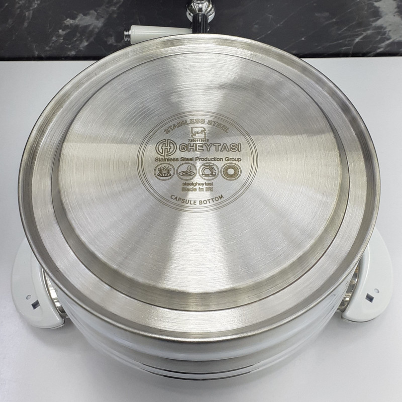 استیل ۱۸/۱۰ با ضخامت ۱ میلی متر - کفه چدنی سه لایه (Capsule Bottom) و دسته های نسوز - دارای نشان استاندارد و گواهی ISO ۹۰۰۱