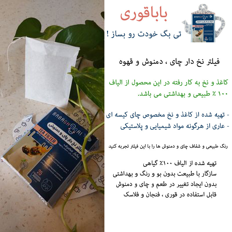 - تهیه شده از الیاف 100% گیاهی - سازگار با طبیعت بدون بو و رنگ و بهداشتی - بدون ایجاد تغییر در طعم و چای و دمنوش - قابل استفاده در قوری ، فنجان و فلاسک