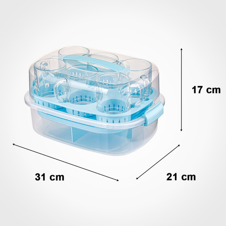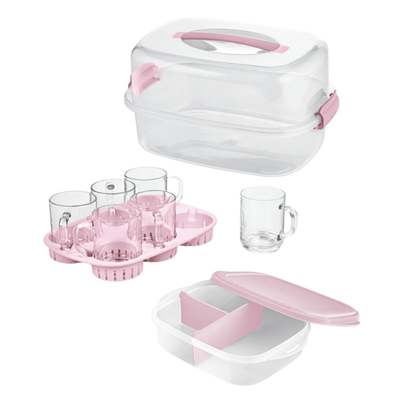 اقلام داخل بسته : 6 عدد لیوان شیشه ای دسته دار + سینی سرو + نظم دهنده 3 قسمته + باکس حمل / کاربرد :پیکنیک، سفر، محل کار