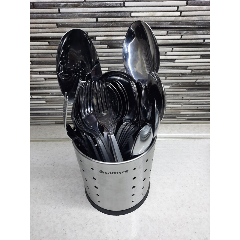 جا قاشقی سام ست ، از جنس استیل ضد زنگ میباشد . این جاقاشقی دارای رنگ بندی های متفاوتی میباشد و برای انواع قاشق و چنگال و کارد و کفگیر و ملاقه و ....... بسیار جا دار میباشد .