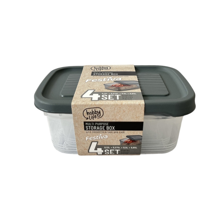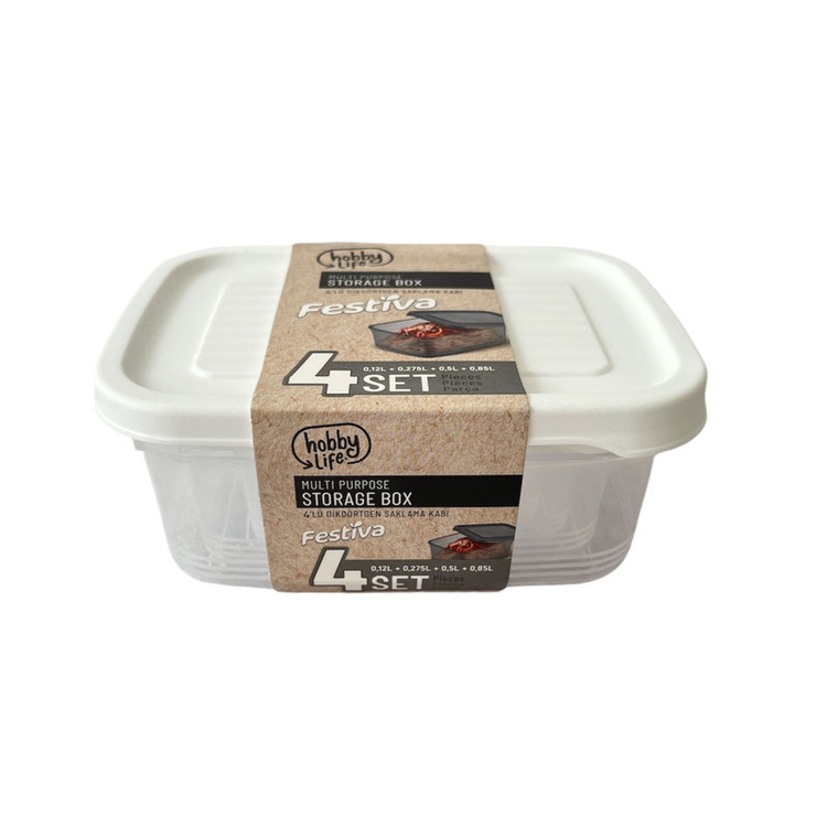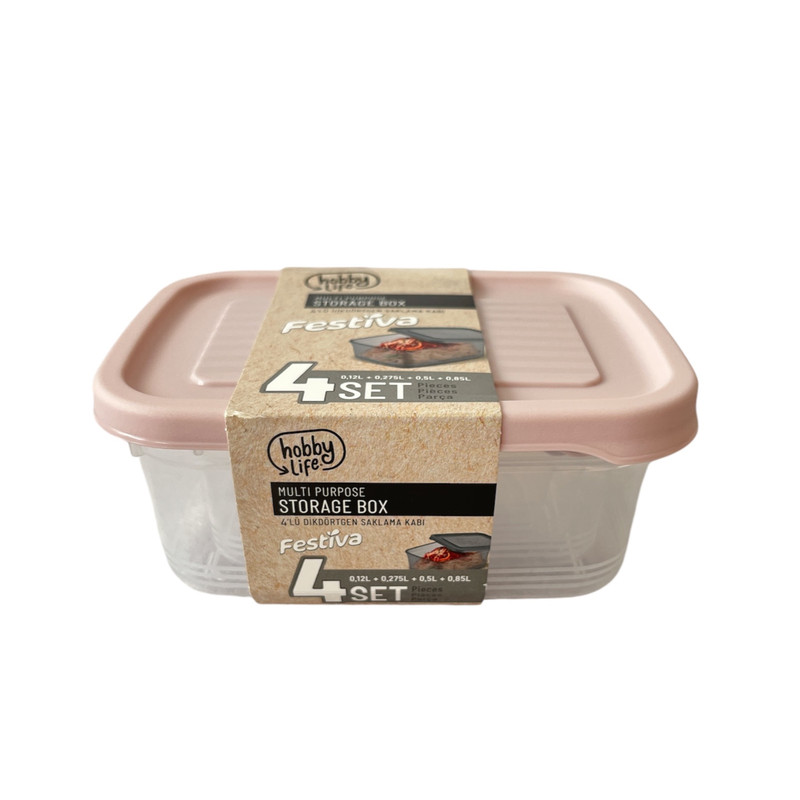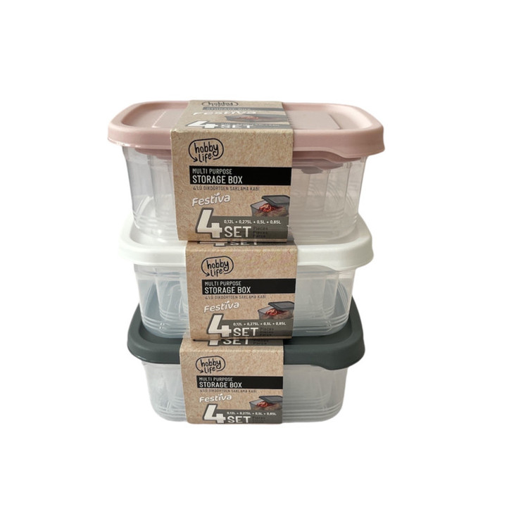 ظرف نگهدارنده 4 عددی هوبی لایف مدل فستیوا کد 021361 در 4 سایز 850 میلی لیتر، 500 میلی لیتر، 275 میلی لیتر و 120 میلی لیتر مناسب برای نگهداری انواع میوه ها و سبزیجات و سالاد و غذا ها در یخچال و فریزر ساخت کشور ترکیه