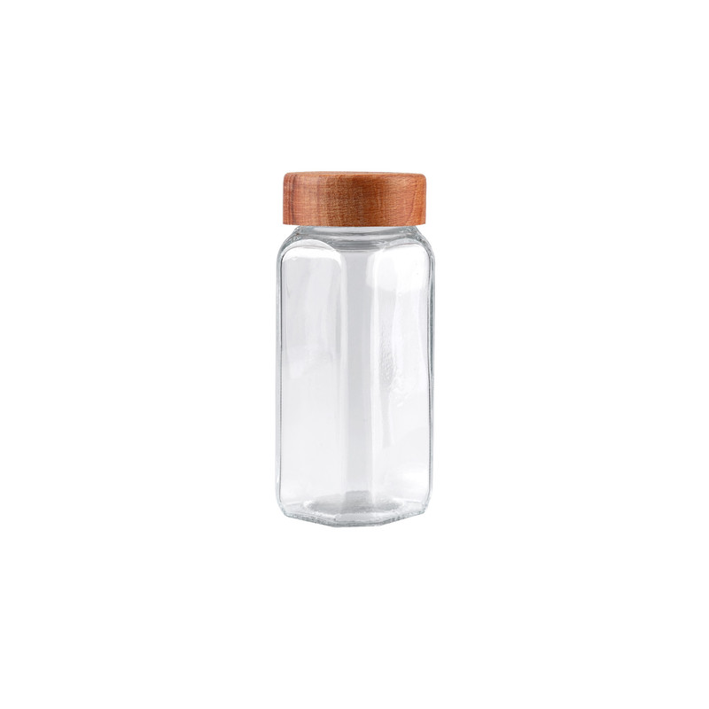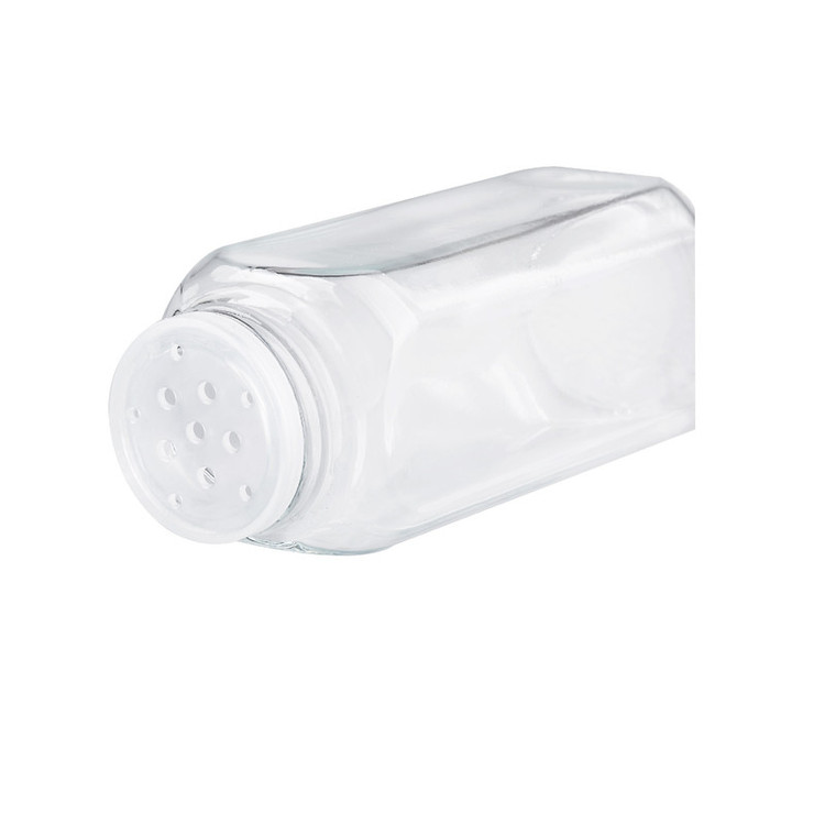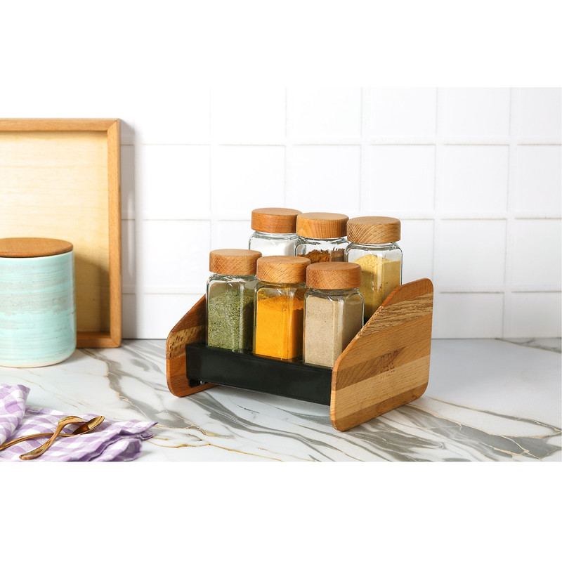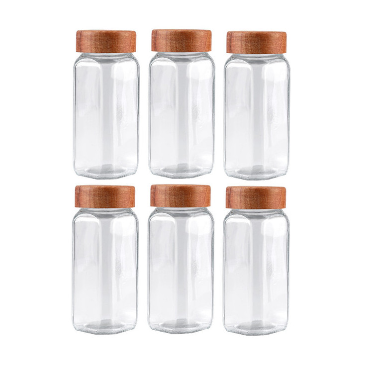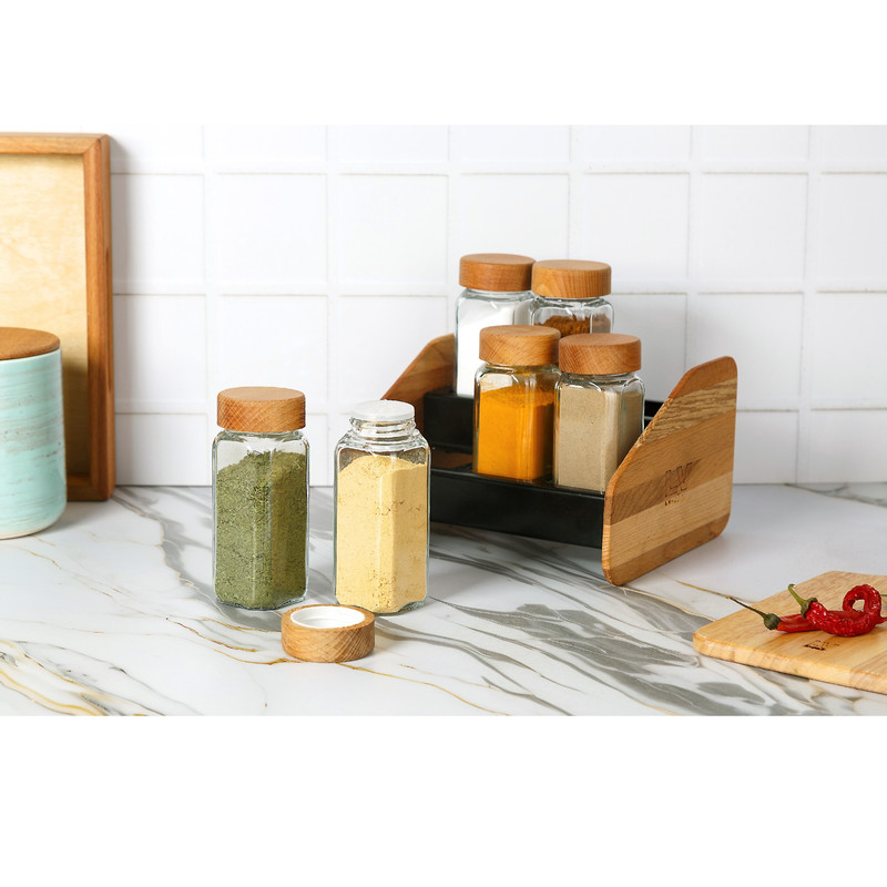 6 عدد ادویه پاش شیشه ای با درب چوبی که حاوی درپوشی سوراخ دار است تا ادویه به میزان لازم قابل استفاده شود.