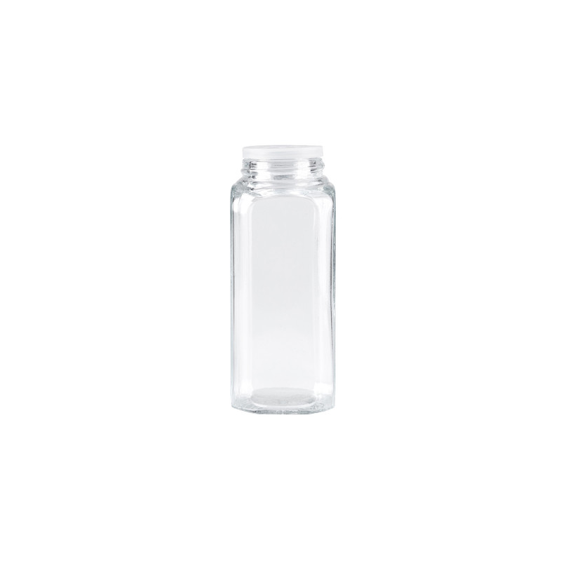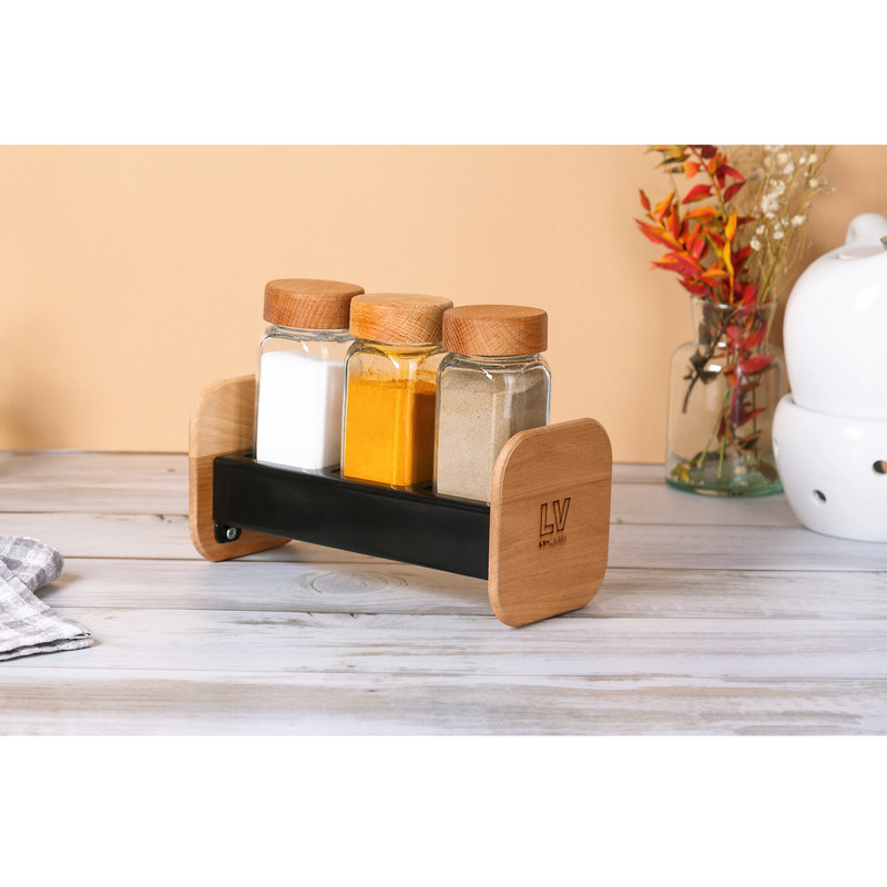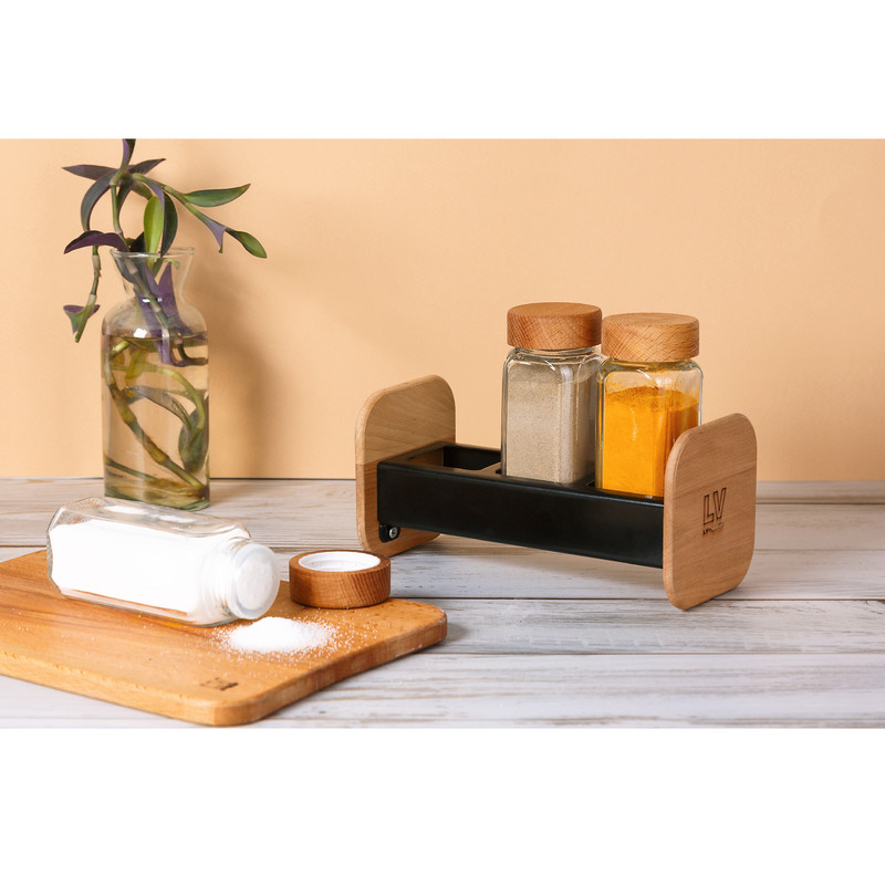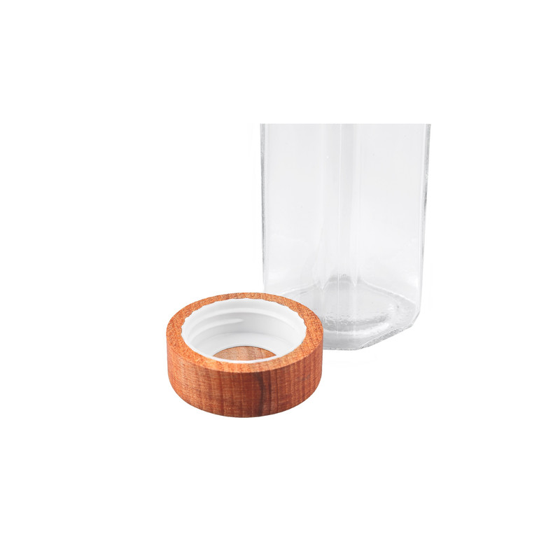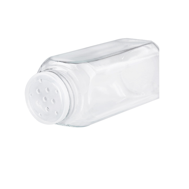 6 عدد ادویه پاش شیشه ای با درب چوبی که حاوی درپوشی سوراخ دار است تا ادویه به میزان لازم قابل استفاده شود.