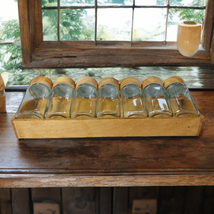 تعداد ۷ عدد جا ادویه مربع ارتفاع ۱۰ سانت درب چوبی به همراه یک استند چوبی ارائه میشود