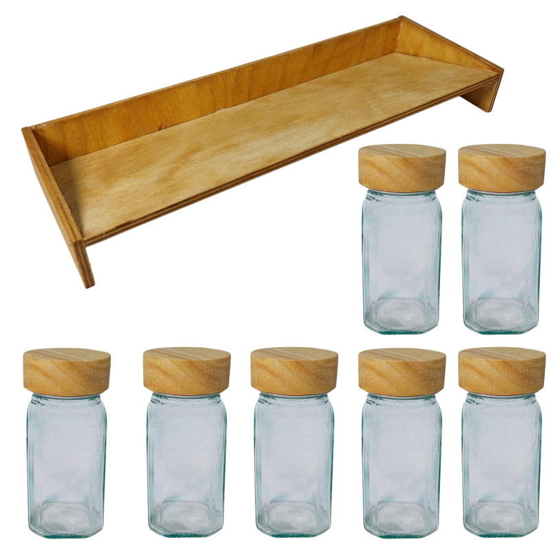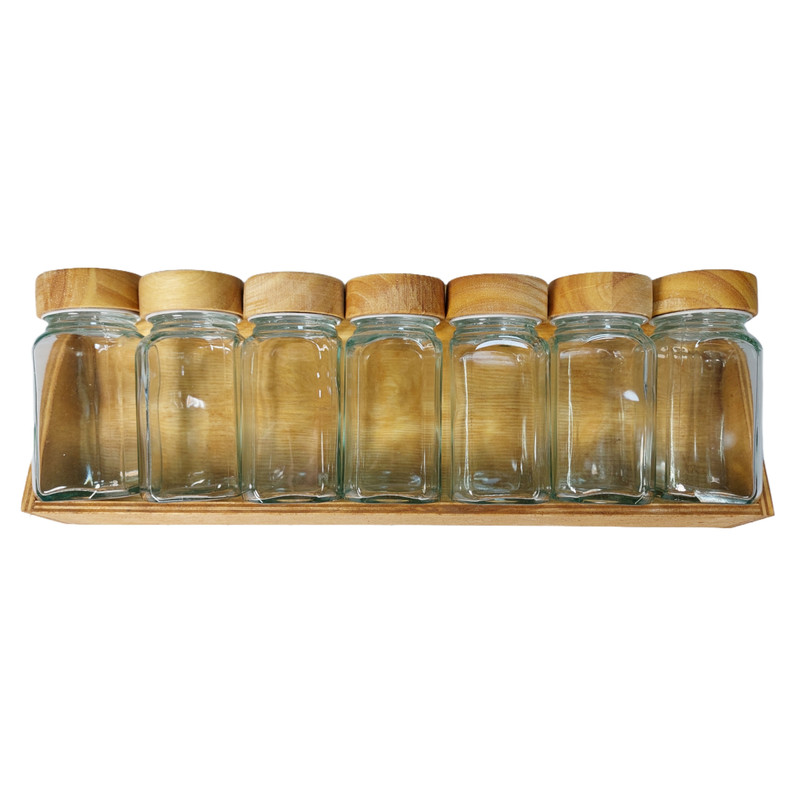 تعداد ۷ عدد جا ادویه مربع ارتفاع ۱۰ سانت درب چوبی به همراه یک استند چوبی ارائه میشود