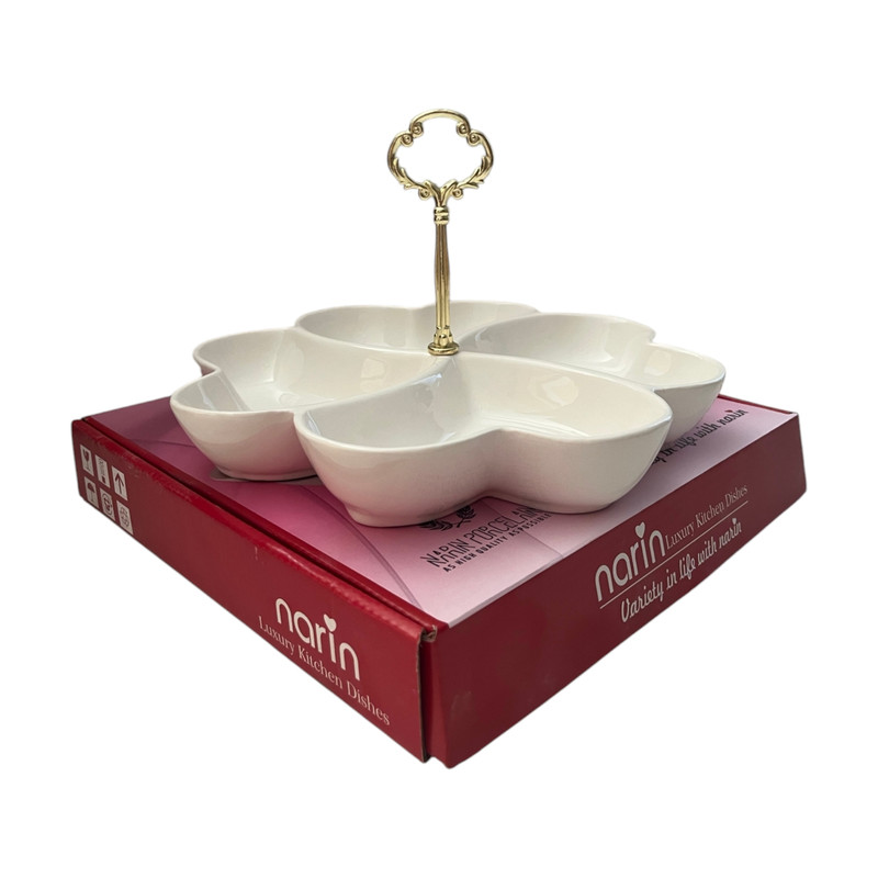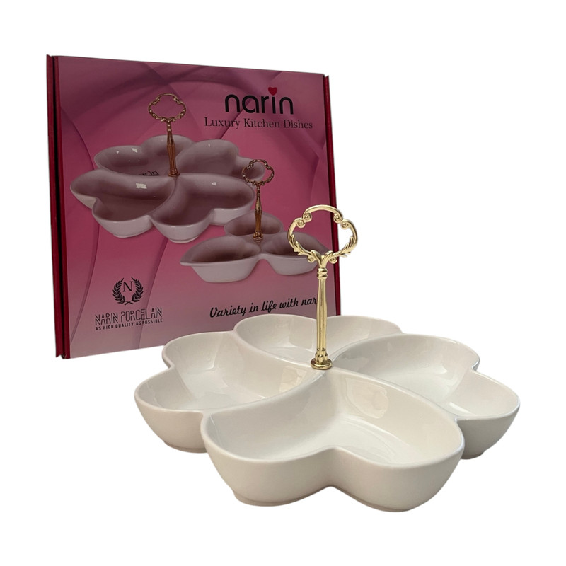 ظرف اردوخوری چهارقلبی فوق العاده زیبا و دارای بدنه ای مرغوب و مقاوم از جنس چینی و دارای یک دسته طلایی متصل و دارای بسته بندی شیک جهت هدیه دادن و مناسب سرو تنقلات و سفره آرایی می باشد.اردوخوری چهار قلبی توسط شرکت تولیدی چینی نارین تولید و توزیع می گردد.