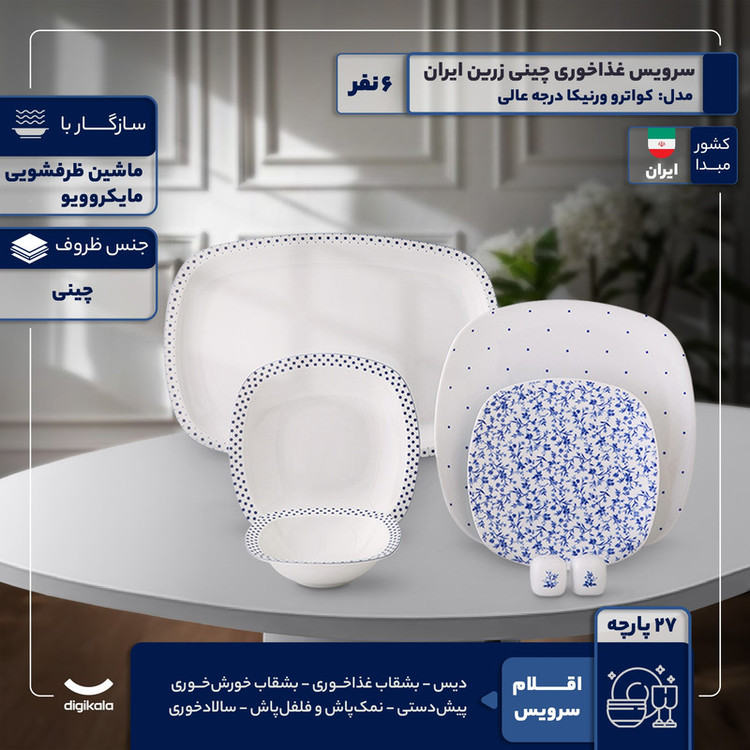 سرویس غذاخوری 27 پارچه 6 نفر چینی زرین ایران مدل کواترو ورنیکا درجه عالی