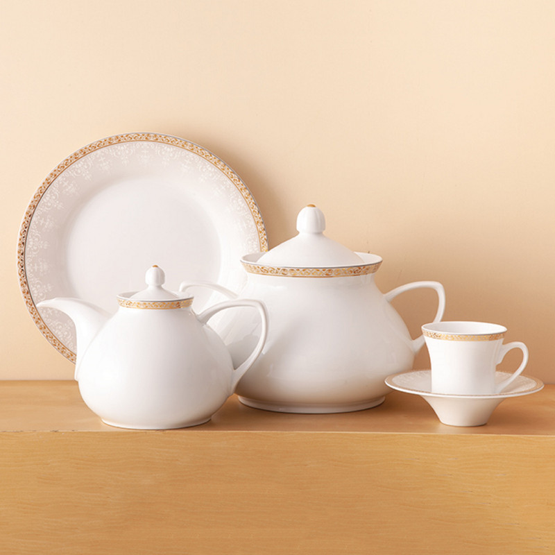 سوپخوری , ظرف سالاد , دیس , بشقاب غذاخوری , بشقاب خورشخوری , پیشدستی , قوری چایخوری , فنجان , نعلبکی , قندان , نمکپاش و فلفلپاش , شیرخوری , پیاله