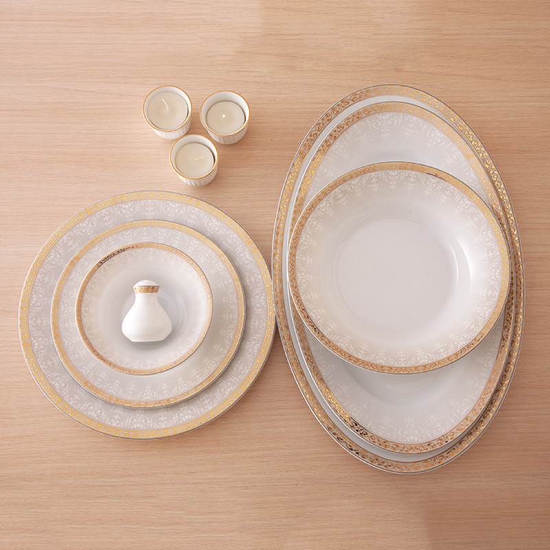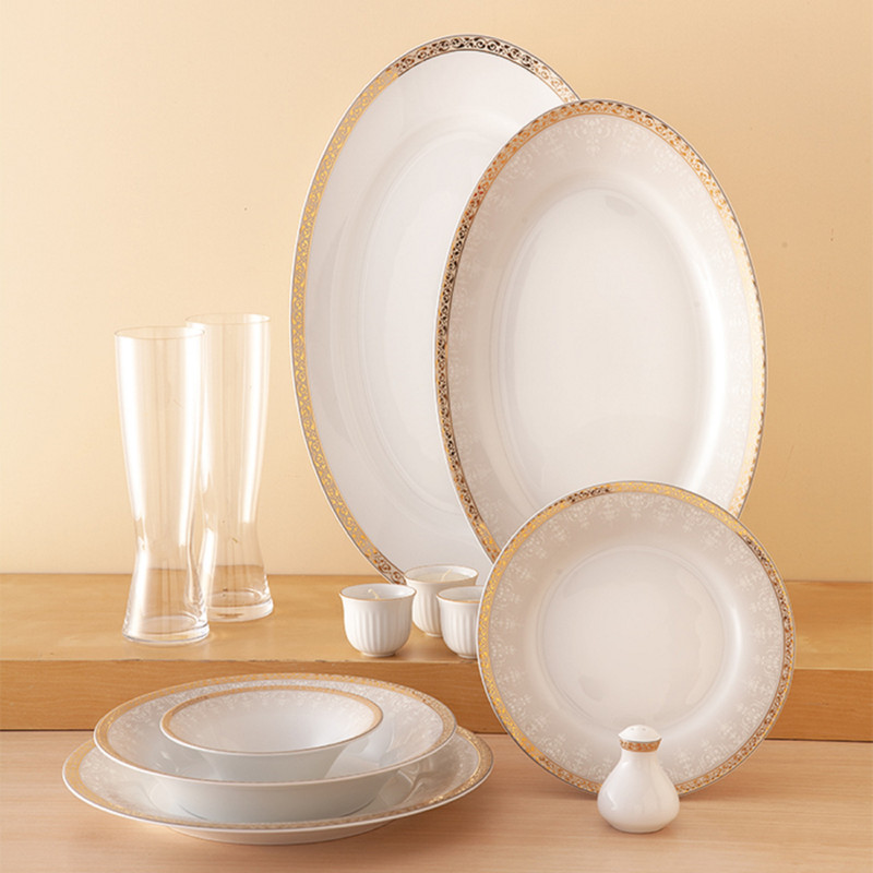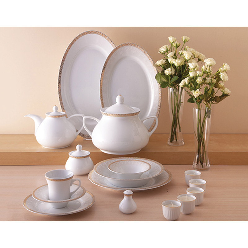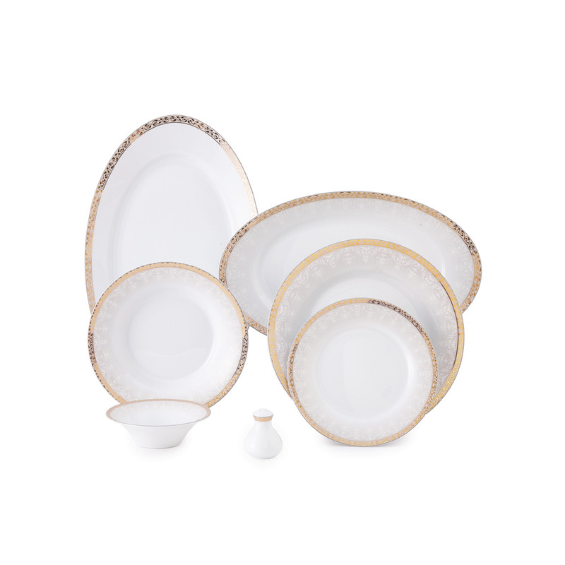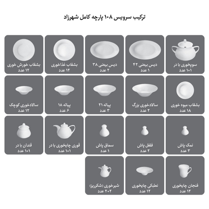 سوپخوری , ظرف سالاد , دیس , بشقاب غذاخوری , بشقاب خورشخوری , پیشدستی , قوری چایخوری , فنجان , نعلبکی , قندان , نمکپاش و فلفلپاش , شیرخوری , پیاله