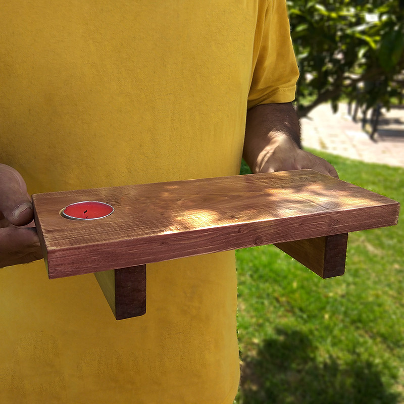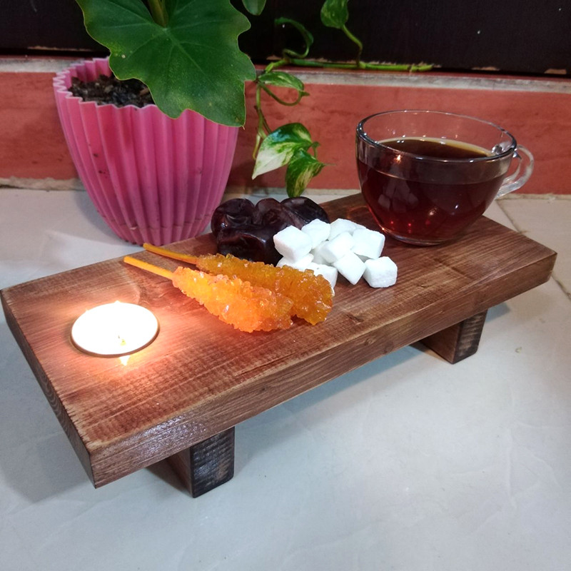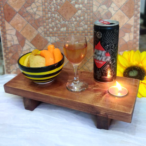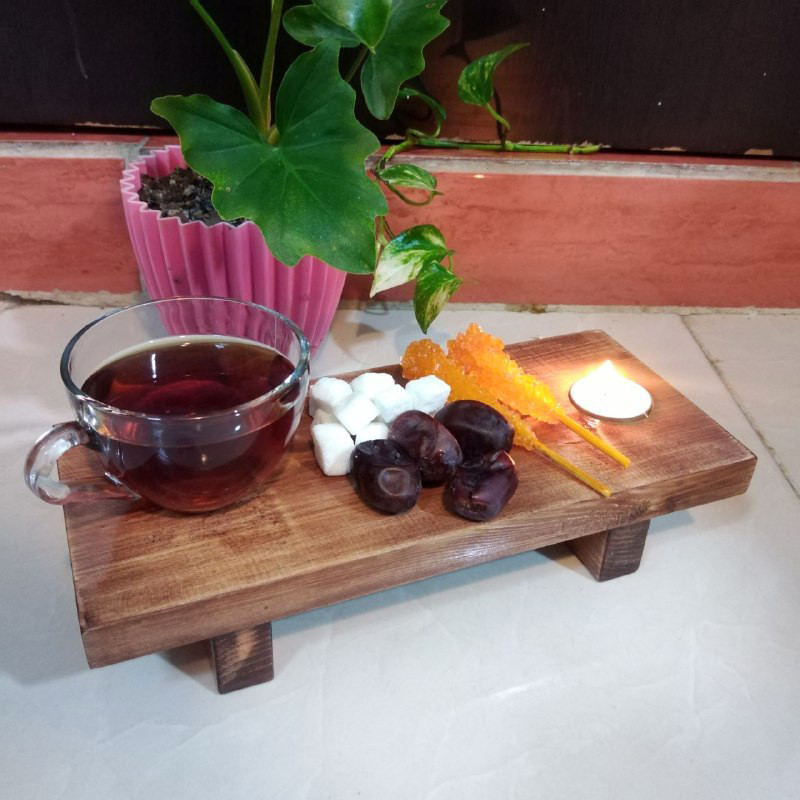 امروزه استفاده از ظروف چوبی به خاطر زیبایی خاص و ایجاد حس خوب رو به افزایش است. این محصول چوبی دارای پوشش روغن گیاهی و قابل شستشو می باشد. ارتفاع پایه زیرین 5 سانتی متر می باشد. و جا شمعی تعبیه شدهروی تخته سرو زیباییش را دو چندان کرده است.