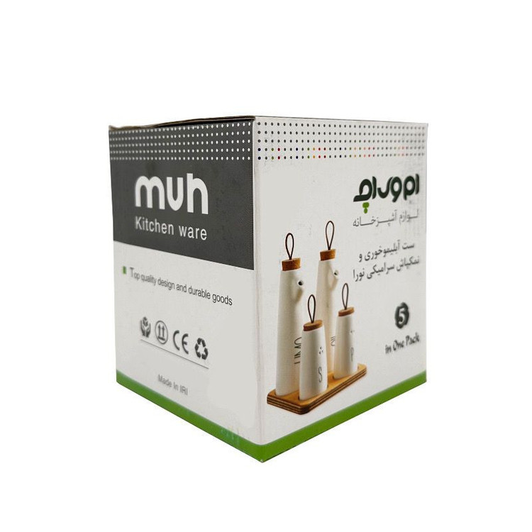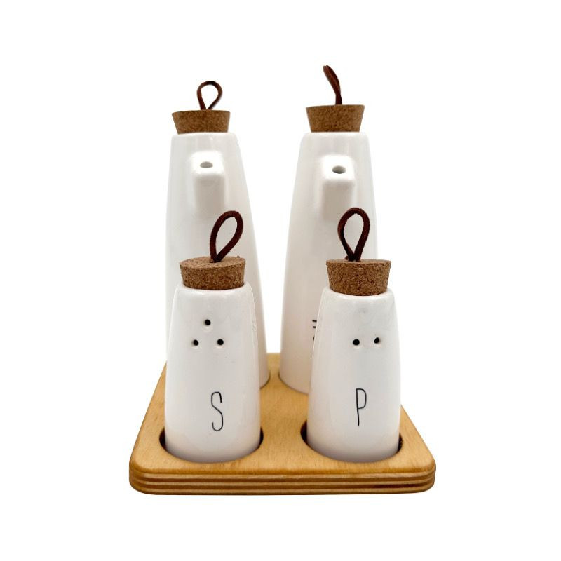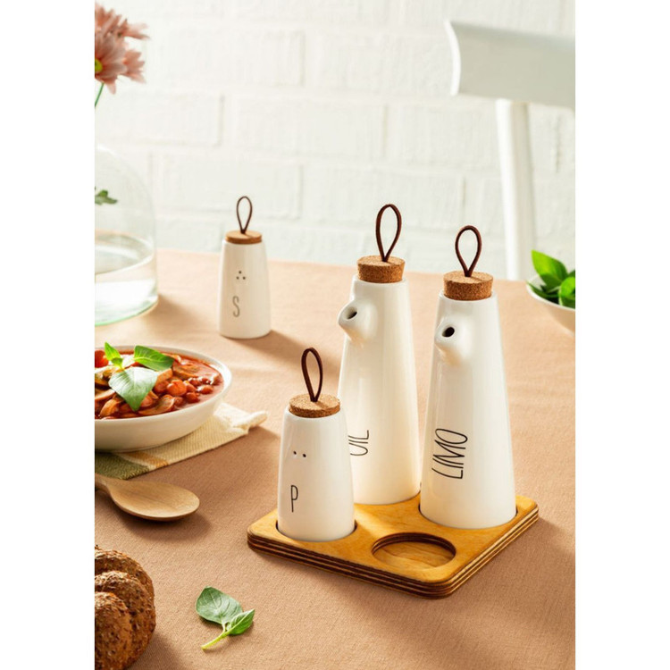 شامل نمک پاش و فلفل پاش و روغن ریز و آبلیمو خوری که بر روی یک استند چوبی قرار میگیرد.