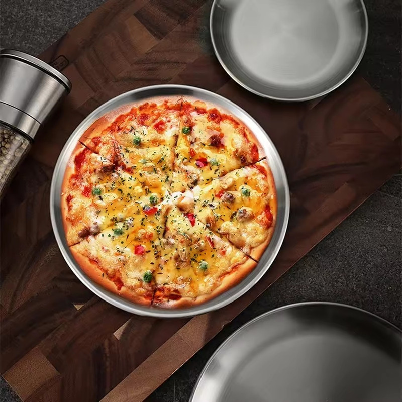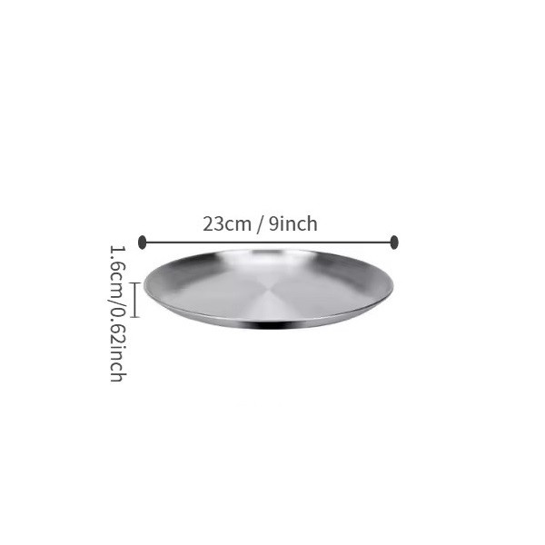 بشقاب استیل ضد زنگ(نگیر) با قطر 23 و عمق 2 سانتیمتر که قابلیت مهم استفاده داخل مایکروفر را نیز دارد. این بشقابهای طرح کُرهای را هم به عنوان ظرف سرو سرد و هم ظرف پخت غذا در منزل و کمپینگ میتوان استفاده نمود.