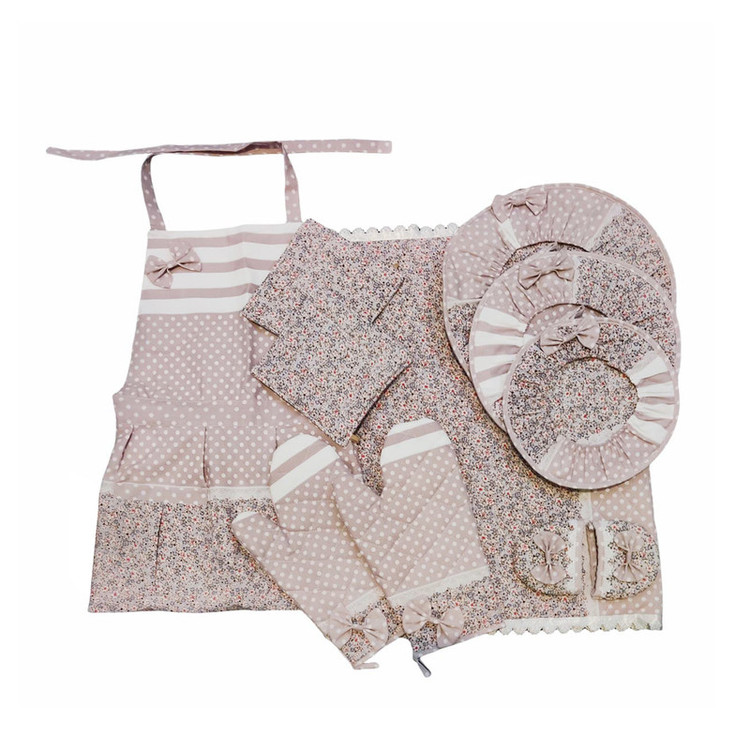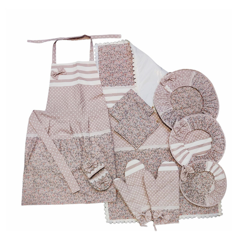 شامل: سه عدد دمکنی , یک جفت دستکش فر , یک عدد پیشبند , آبگیر کنار سینک , دو عدد دستگیره قابلمه , دو عدد دستگیره