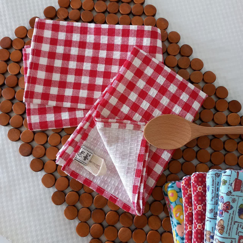 این محصول شامل 2 عدد دستمال آشپزخانه با اندازه ی 35 در 45 سانتی متر میباشد که مناسب برای خشک کردن ظروف یا نظافت آشپزخانه است. دستمال ها با پارچه ی آبگیر لانه زنبوری درجه یک ایرانی دوخته شده اند. لبه های کار با دقت و ظرافت بالایی تا زده و دوخته شده است. دستمال ها دارای بندک آویز می باشند.