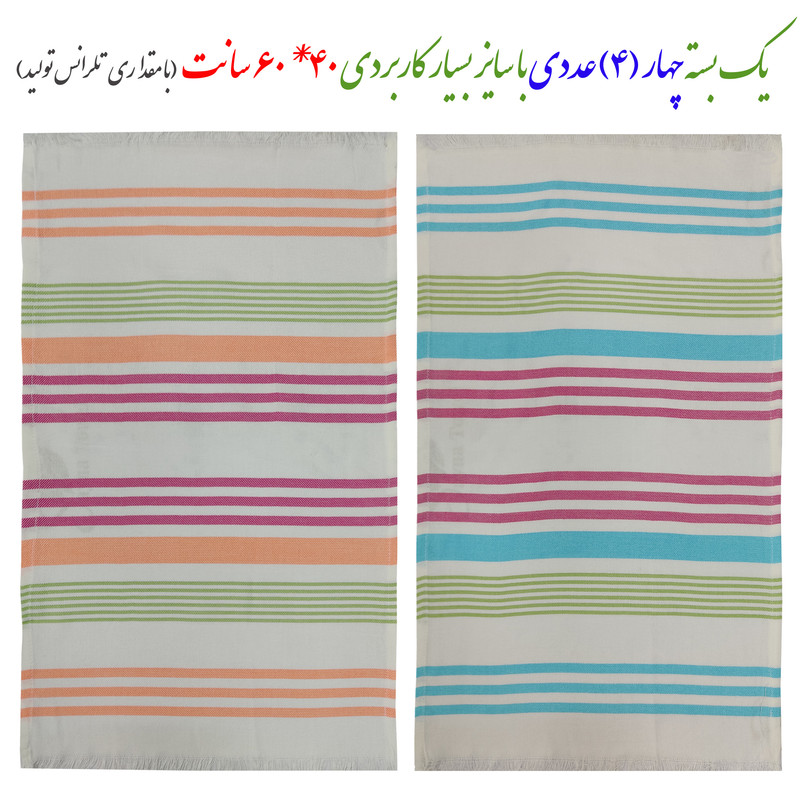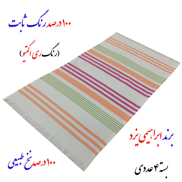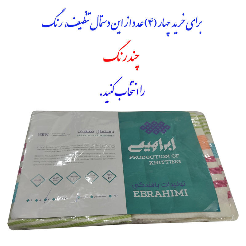 سایر توضیحات: دستمال تنظیف (یا حوله جیبی) ابراهیمی یزد (اصل) صد در صد نخ با الیاف طبیعی و ضد حساسیت ویسکوز با بافت متراکم و آب گیری فوق العاده عالی و رنگ صد در صد ثابت و ری اکتیو در بسته های 4 تایی با سایز هر کدام 60x40 سانتیمتر و وزن بسته 4 عددی 180 گرمی