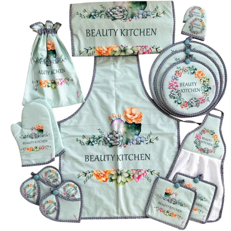 شامل: یک جفت دستکش فر , سه عدد دمکنی , یک عدد کیسه سبزی , یک عدد پیشبند , یک عدد حوله آشپزخانه , دو عدد دستگیره تاوه , دو عدد دستگیره قابلمه , آبگیر کنار سینک , دو عدد دستگیره