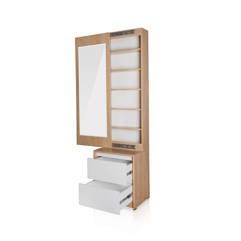 MDF براق لبه نوار دومیل شرکتی ریل کشوها و آینه ساچمه ای سه زمانه دو عدد کشو با عمق مناسب دارای 5 عدد طبقه پشت باکس آینه ریلی