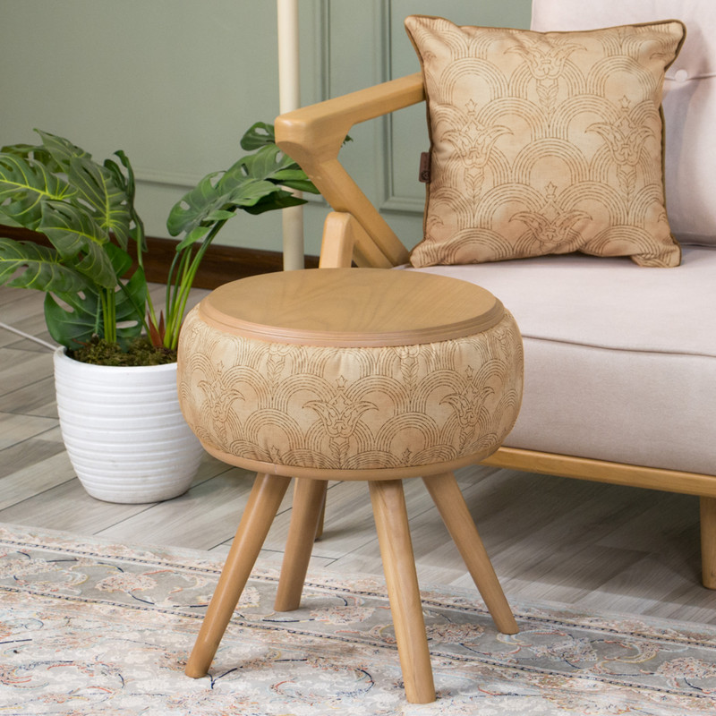 میز عسلی با صفحهی چوبی ثابت به قطر ۴۰ سانتیمتر و ارتفاع ۴۵ سانتیمتر. بدنه از پارچهی مخمل طرحدار با چاپ ماندگار و پایهها از چوب طبیعی با طراحی اریب. مناسب استفاده بهعنوان میز کنار مبلی یا دکوری