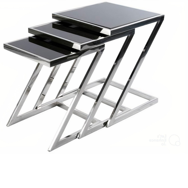 صفحه رویی میز شیشه بوده و هر سه عدد میز به صورت کشویی داخل هم قرار می گیرد که حجم کمی را اشغال می کنند