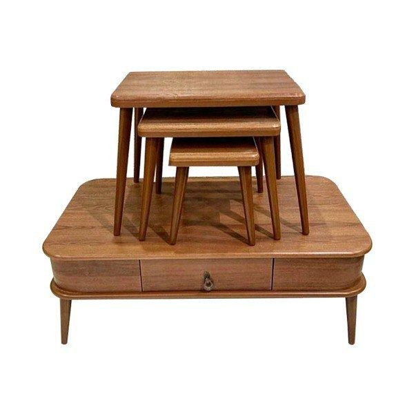 این میز پذیرایی یک ست 4 عددی کلاسیک و محصولی پر فروش میباشد که با بهره گیری از تکنولوژی روز و متریال ام دی اف با روکش وکیوم ساخته شده است. رنگ این کار ثابت بوده و به مرور زمان تغییر نمیکند و در مقابل گرما و سرما و خط و خش مقاوم است. صفحه ضد آب میباشد و به راحتی قابل شستشو و نظافت با انواع شوینده ها است. لبه کار به صورت یک تکه با صفحه روکش شده و بسیار مقاوم و زیباست. همچنین پایه های این محصول از جنس پلیمر ABS و بسیار محکم هستند.