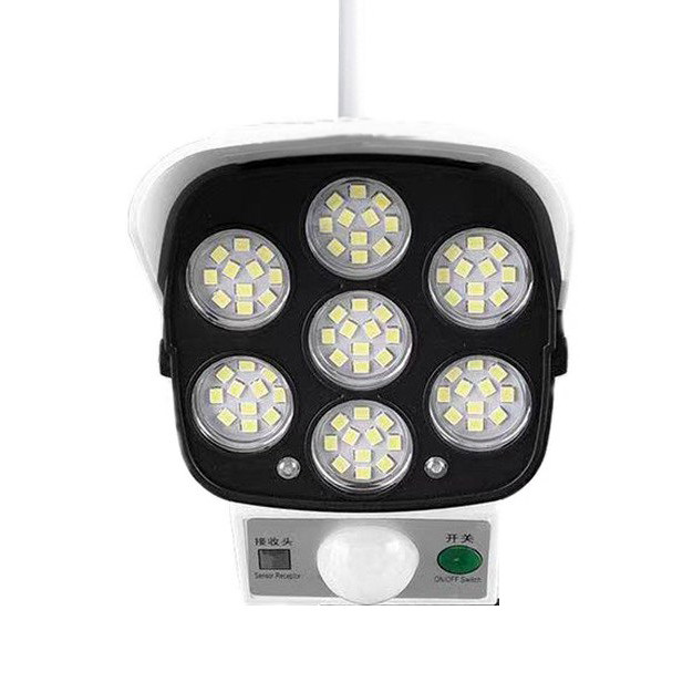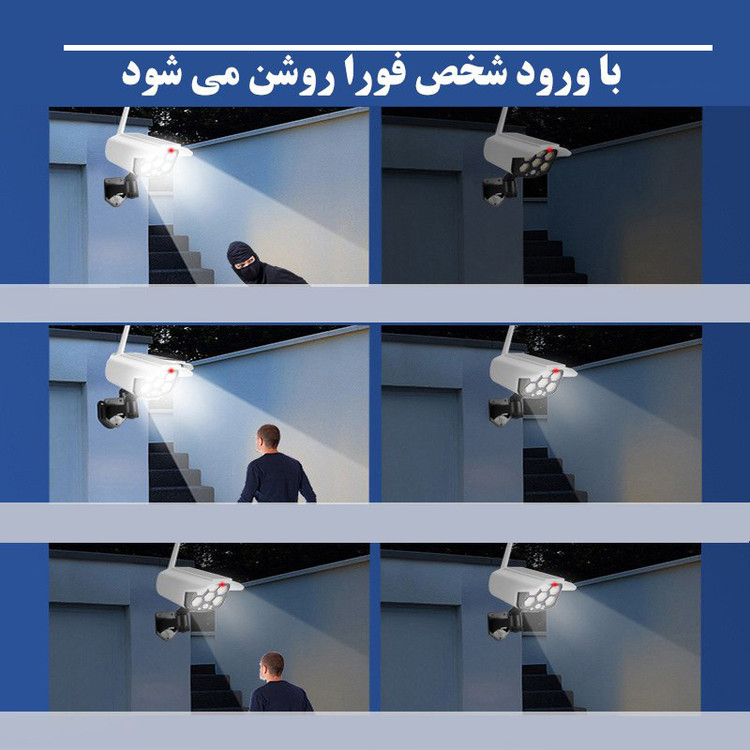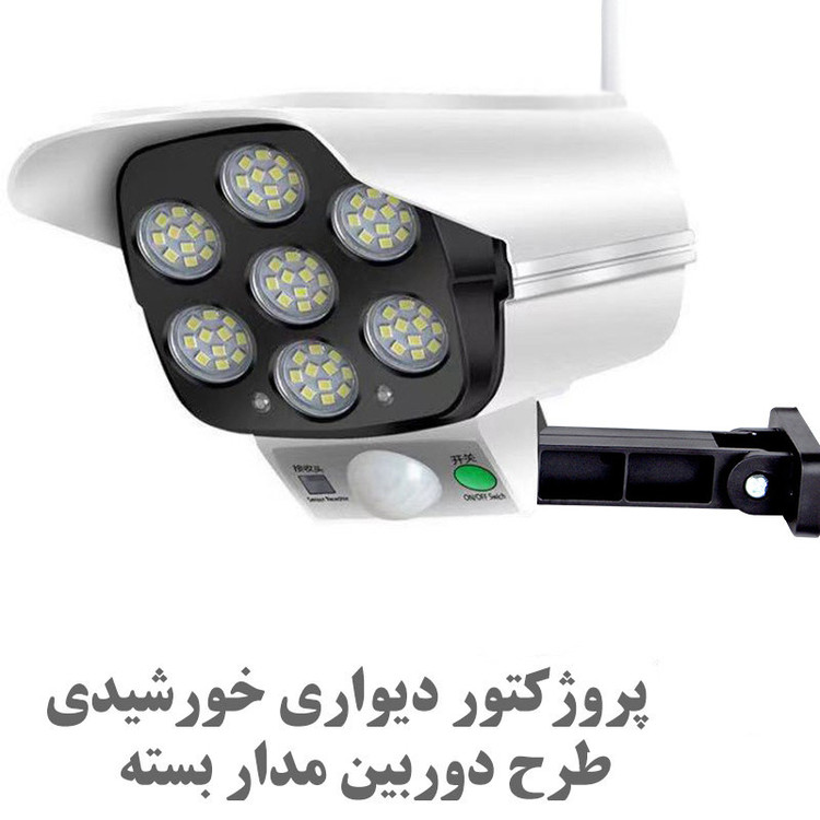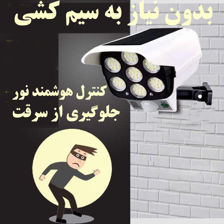 شارژ با انرژی خورشیدی روشن شدن با سنسور حساس به تحرک/طراحی ظاهری دوربین مداربسته-شبیه سازی و جلوگیری از سرقت - داراي كنترل و 3 حالت روشنایی - زوایای روشنایی قابل تنظیم-چرخش افقی 360 درجه و چرخش عمودی 90 درجه / 63 لامپ COB