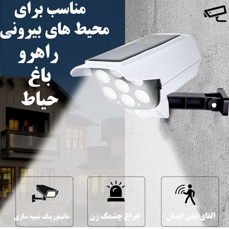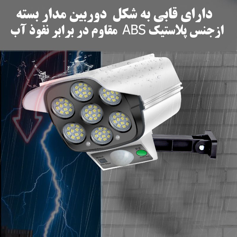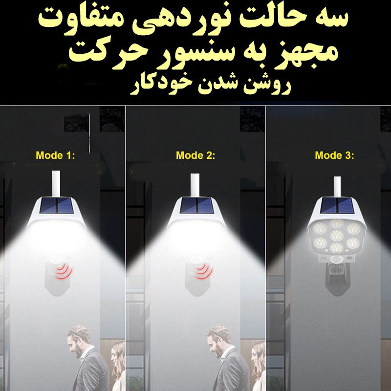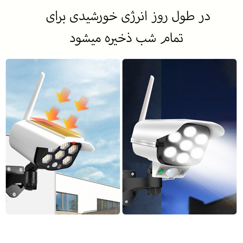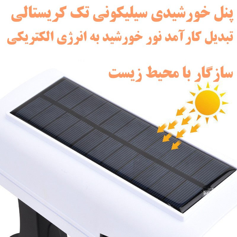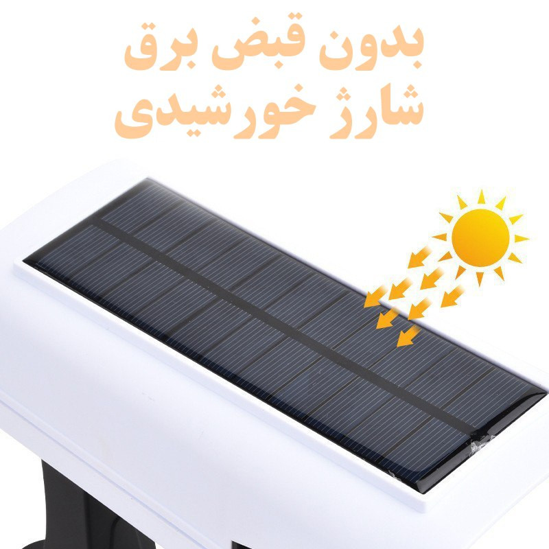 شارژ با انرژی خورشیدی روشن شدن با سنسور حساس به تحرک/طراحی ظاهری دوربین مداربسته-شبیه سازی و جلوگیری از سرقت - داراي كنترل و 3 حالت روشنایی - زوایای روشنایی قابل تنظیم-چرخش افقی 360 درجه و چرخش عمودی 90 درجه / 63 لامپ COB