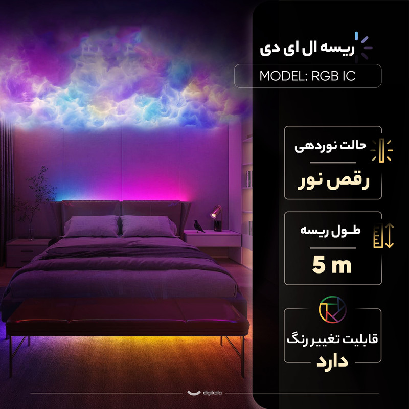 ریسه ال ای دی هوشمند مدل سقف ابری کد RGB IC با طول ۵ متر، گزینهای ایدهآل برای ایجاد فضایی جذاب و مدرن است. این ریسه با ۳۰۰ عدد لامپ LED و توان ۱۶ وات، نوردهی قدرتمندی ارائه میدهد که به راحتی قابل تنظیم است. قابلیت تغییر رنگ و حالتهای نوردهی متغیر، امکان خلق جلوههای نوری متفاوت را فراهم میکند و محیط شما را به یک فضای پویا و دلپذیر تبدیل میکند. ابعاد ۵۰۰x۸x۳ سانتیمتر و وزن سبک ۱۴۰ گرم این محصول، نصب و استفاده از آن را آسان کرده است. ولتاژ کاری ۱۲ ولت، مصرف انرژی بهینهای را تضمین میکند و پایه سیمی آن انعطافپذیری بالایی در نصب به همراه دارد. طراحی مدرن و کاربری متنوع این ریسه، آن را به انتخابی عالی برای استفاده در فضاهای مختلف نظیر اتاق خواب، سالنها و حتی رویدادها تبدیل کرده است. اگر به دنبال ریسهای با قابلیتهای هوشمند و کارآمد هستید، این مدل با کیفیت و دوام بالا، انتظارات شما را برآورده خواهد کرد.