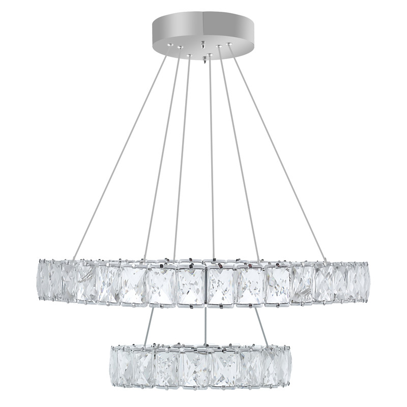 لوستر سقفی دکورابو کد ClR 4020 دو حلقه ای دایره با قطر های 40×40 سانتیمتر و 20×20 سانتیمتر متشکل از سوپر کریستال 3×5 سانتی متر دارای 3 حالت نور،مهتابی،آفتابی و نچرال ریموت کنترل تنظبم ارتفاع اولین حلقه تا سقف 70 سانتی متر قابلیت کم و زیاد کردن ارتفاع و تنظیم جداگانه حلقه ها جنس بدنه ضد زنگ و ضد رطوبت