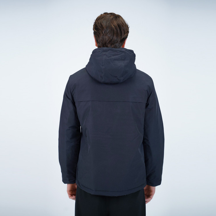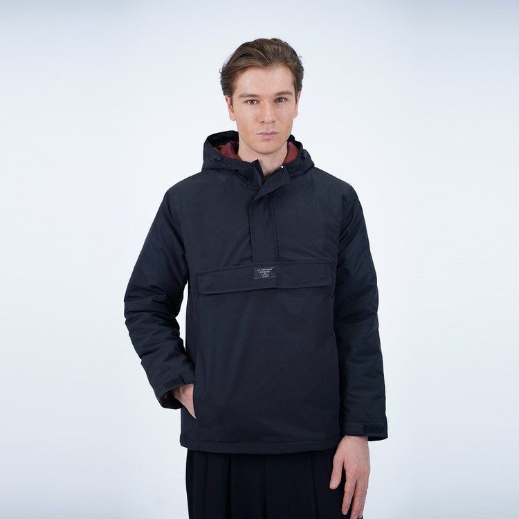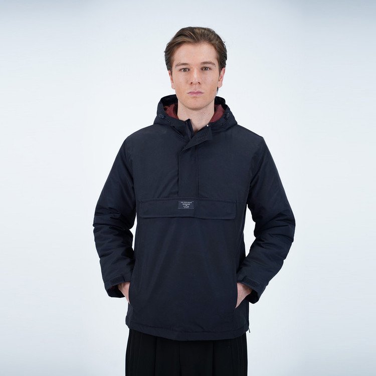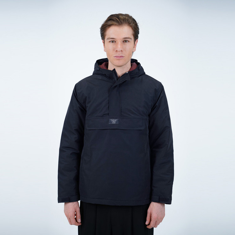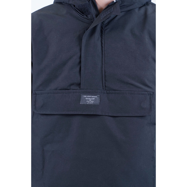 کلاهدار (کلاه ثابت) / جلو بسته / دو جیب جانبی / قد تا بالای زانو / رنگ سرمه ای .