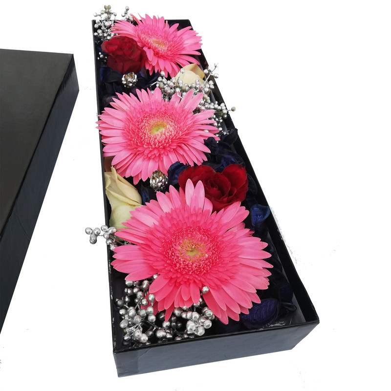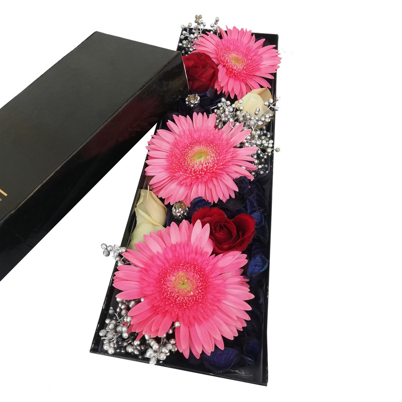 1. رز هلندی2 شاخه می باشد. 2. ژربرا 3 شاخه می باشد. 3. گل خشک 2 شاخه می باشد. 4. برگ های تزئینی: یاس هلندی نقره ای می باشد. - جعبه مقوایی مستطیل می باشد.