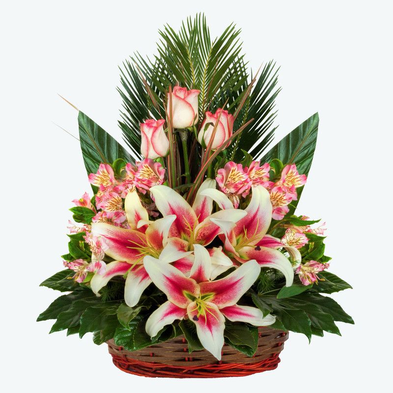 این سبد با گل های 3 عدد گل رز ، 3 عدد گل آلسترومریا، 3 عدد گل لیلیوم و با برگ های تزئینی؛ گل آرایی می شود. سبد گل لیلیوم صورتی مناسب برای مراسم افتتاحیه، خواستگاری، عروسی، نامزدی، عیادت و عقدکنان می باشد. امکان چاپ و درج پیام وجود دارد.