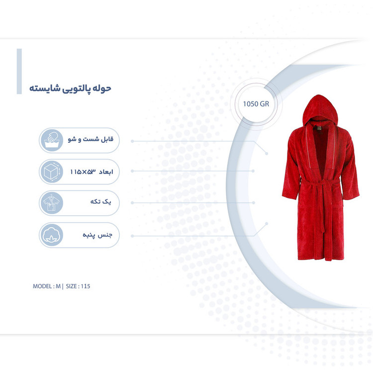 - حوله پالتویی سایز 115 (مدیوم) - کیفیت عالی - جذب آب بالا - اندازه عرض شانه 53 سانتی متر - مناسب برای افراد کمتر از 70 کیلوگرم