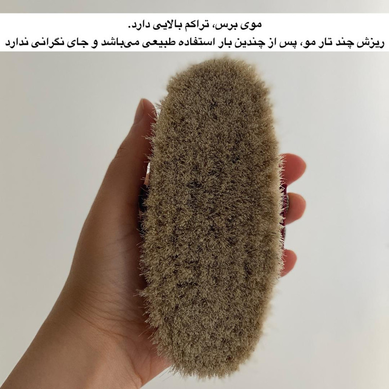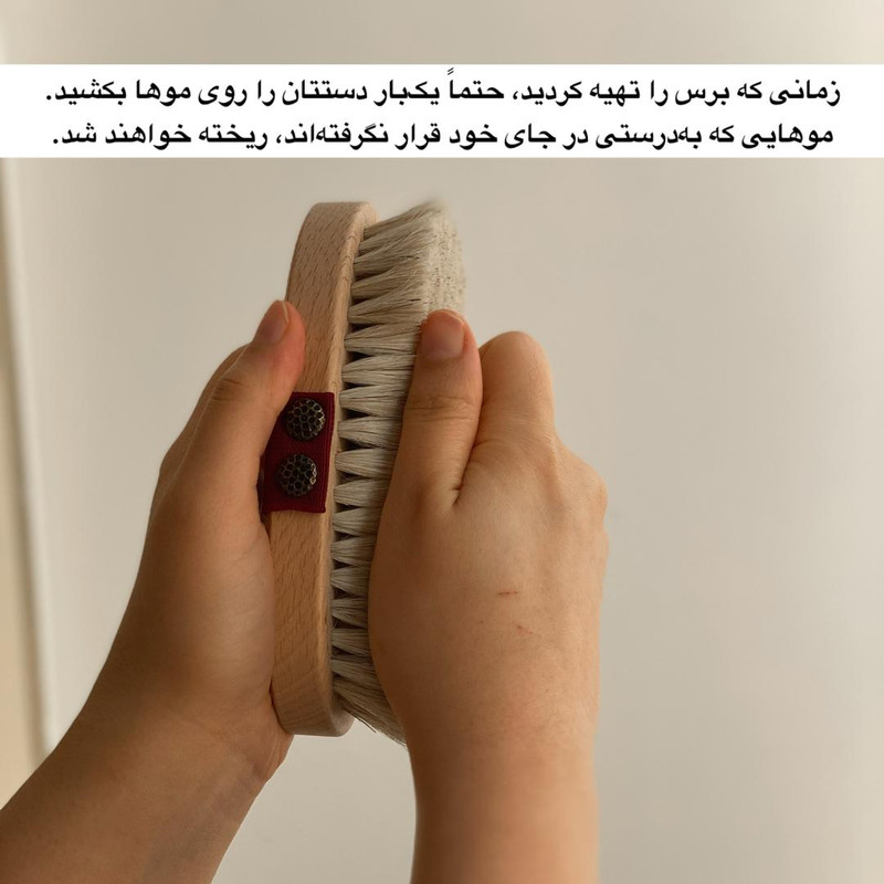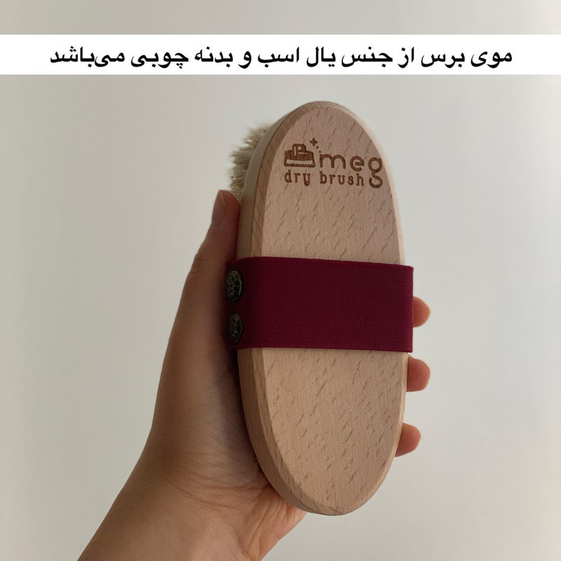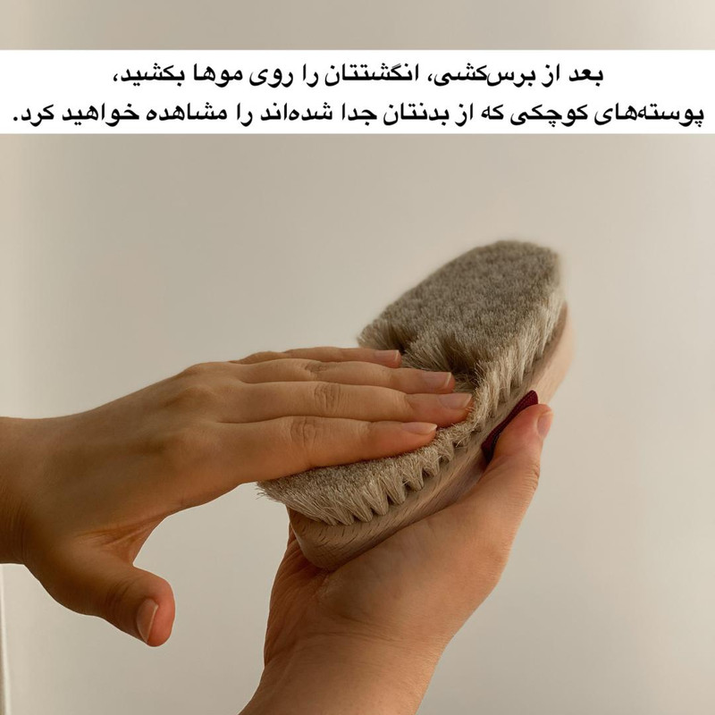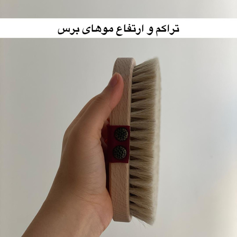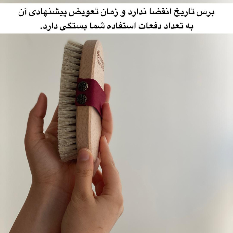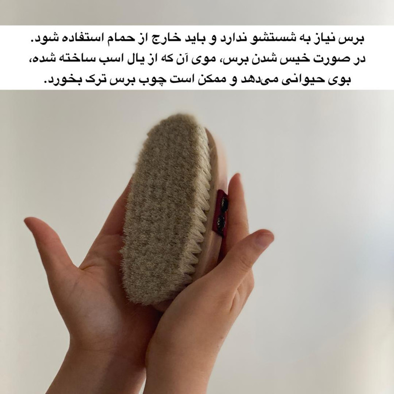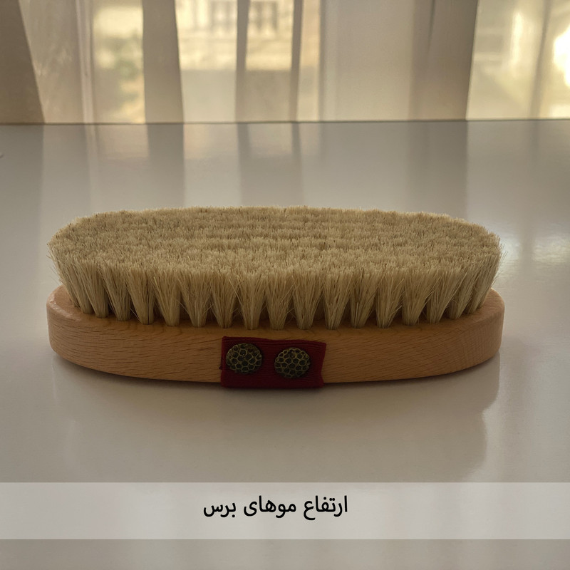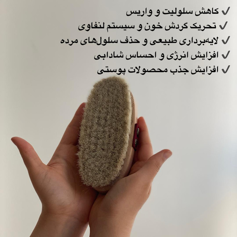 این برس درواقع اسمش برس خشک بدن dry brush هستش و باید خارج حمام استفاده بشود. چه خاصیتی دارد؟ اول از همه اینکه خیلی خیلی حس خوبی میدهد - بهتر شدن گردش خون - لایه برداری ملایم پوست - جلوگیری و از بین بردن سلولیت - براق شدن پوست بدن .چجوری انجام بدیم؟ از پاها شروع کنید و به سمت بالا برس بکشید. برای قسمت دست ها برس رو به سمت قلبتون بکشید. برس کشیدن روی قسمت های شکم و سینه بصورت چرخشی انجام بشود. بعد برس کشیدن اگر انگشتتون رو روی موها بکشید، پوسته های کوچیک رو که از بدنتون جدا شده می بینید. یادتون باشه برس کشیدن باید بطور منظم انجام بشه تا نتیجه بگیرید. این برس از یال اسب ساخته شده و بدنه چوبی دارد.