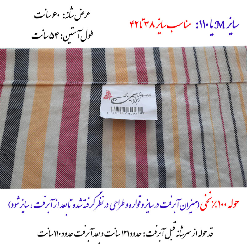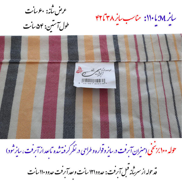 حوله تولید یزد 100 درصد نخ سایز مدیوم (M) یا اصطلاحا 110 با بالاترین کیفیت. سایزها طوری طراحی شده اند که بعد از آبرفت، اندازه سایز استاندارد شوند. پس نکران آبرفت کار نباشید.