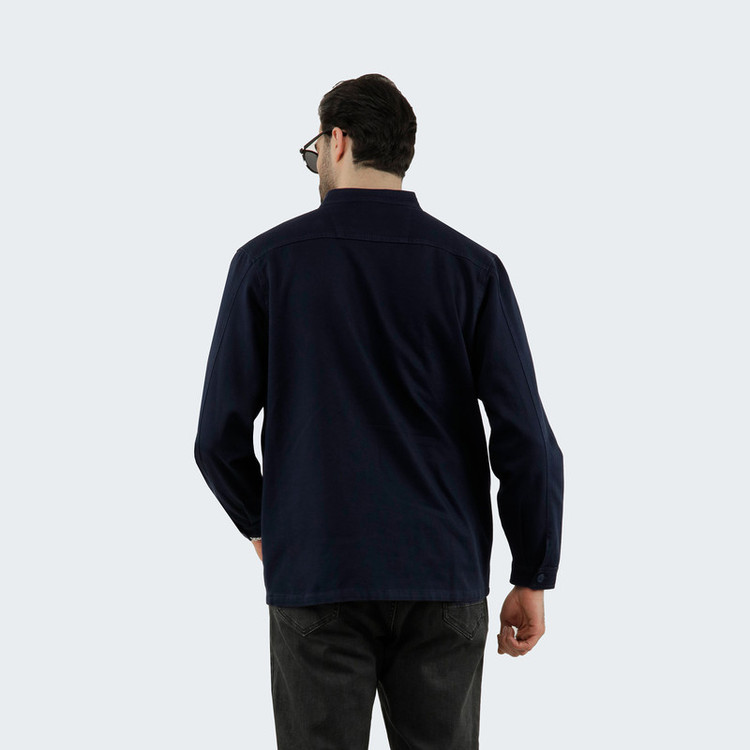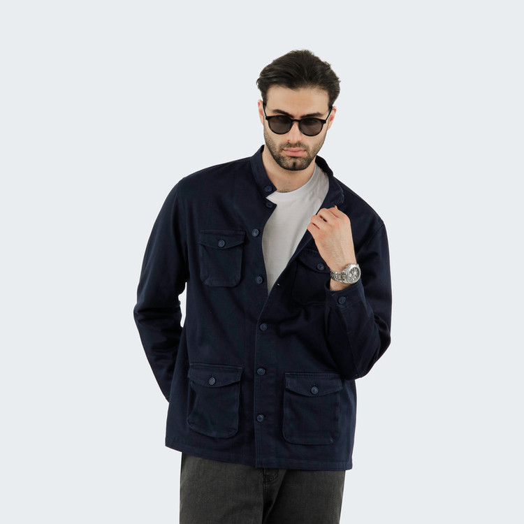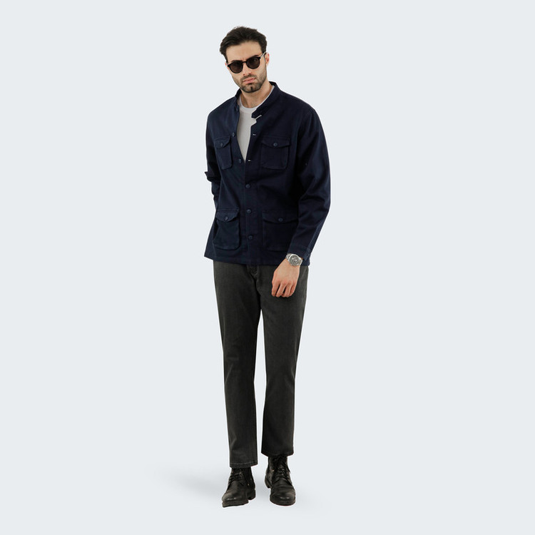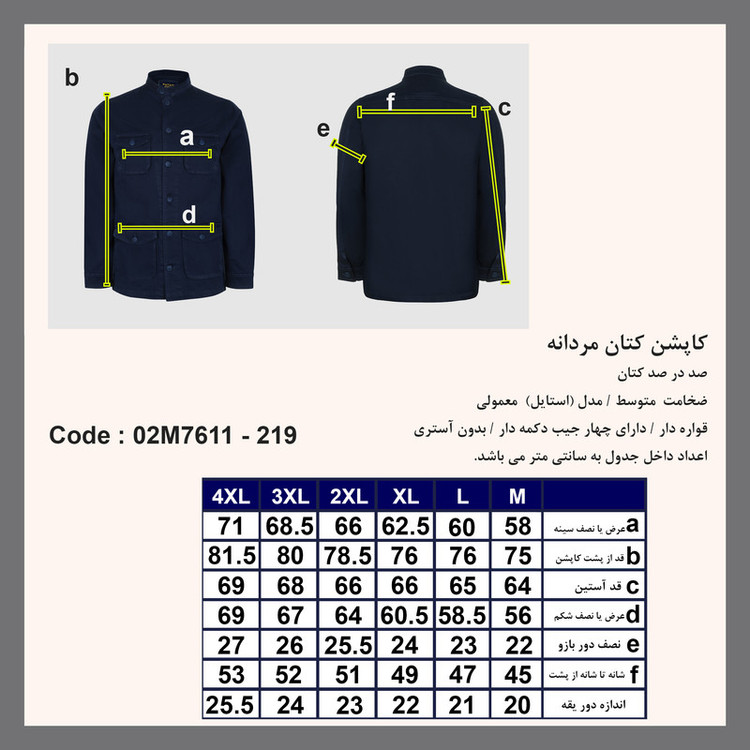 کاپشن بهاره - پاییزه / بدون آستری / دارای چهارجیب در دار دکمه دار روی قسمت جلو کاپشن / رنگ سرمه ای سیر