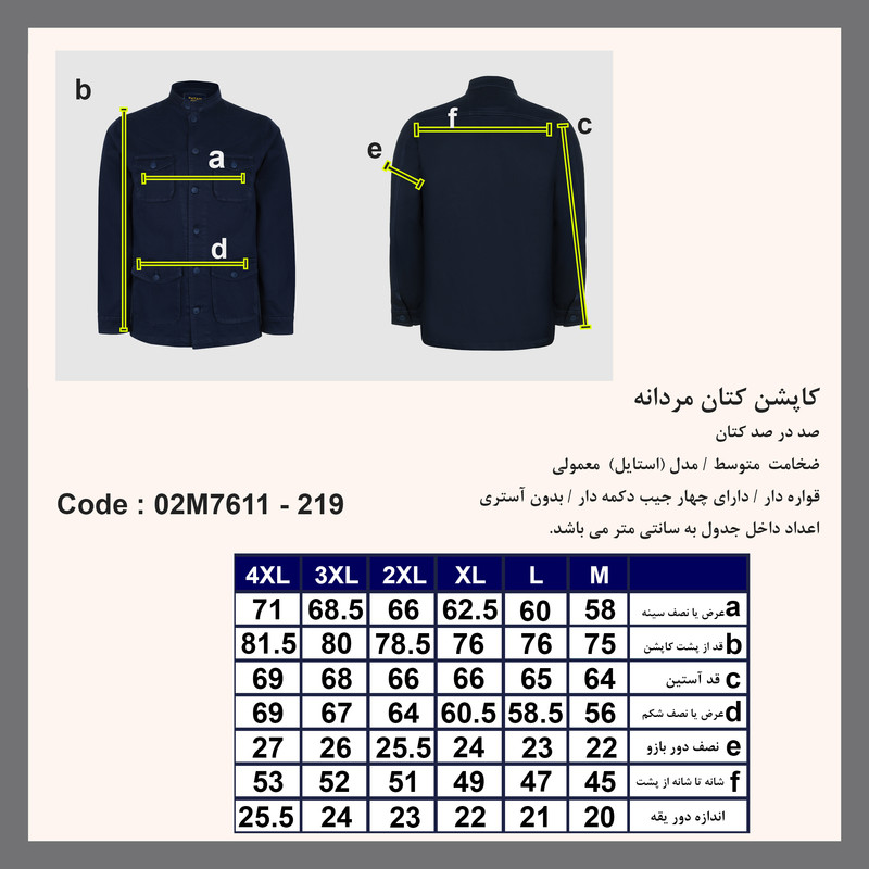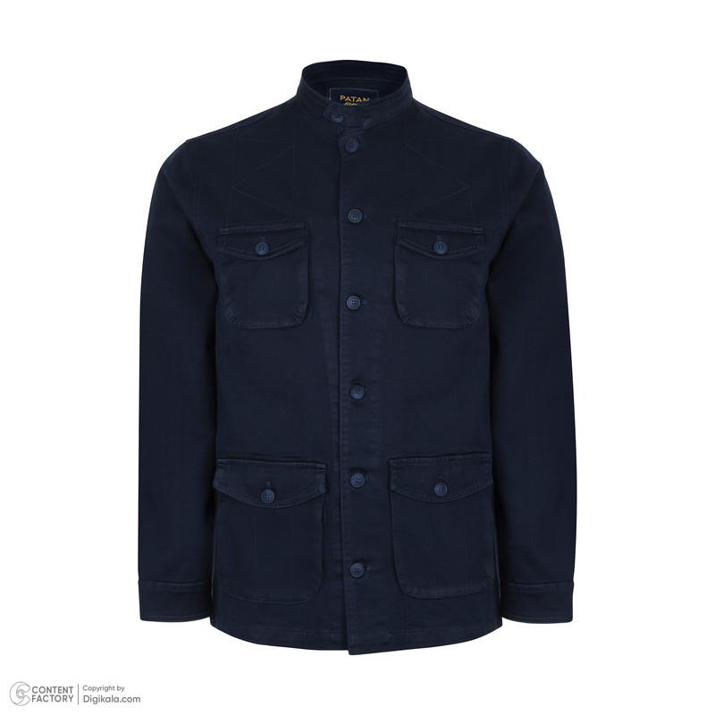 کاپشن بهاره - پاییزه / بدون آستری / دارای چهارجیب در دار دکمه دار روی قسمت جلو کاپشن / رنگ سرمه ای سیر