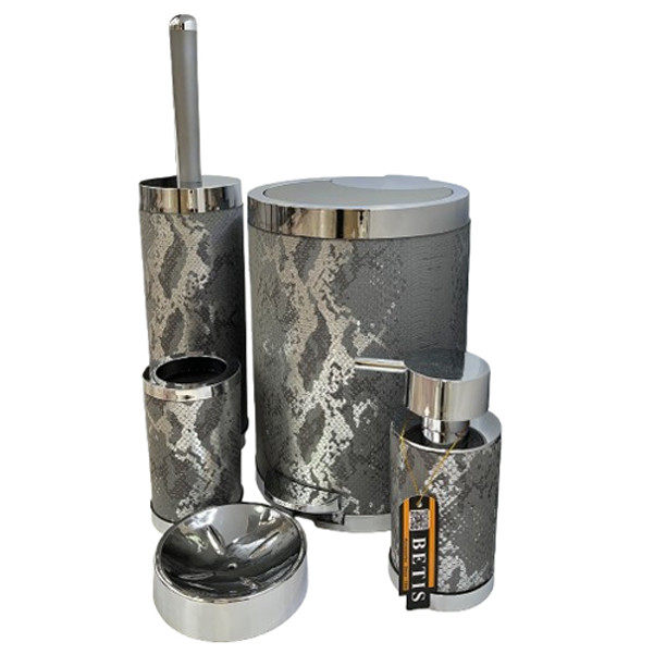 ست سرویس بهداشتی 5 پارچه بتیس مدل لوکس چرم پوست ماری از جنس ABS است که در تهیه مواد اولیه آن از بهترین مواد اولیه مرغوب با بالاترین کیفیت در رنگ و آبکاری استفاده شده است .