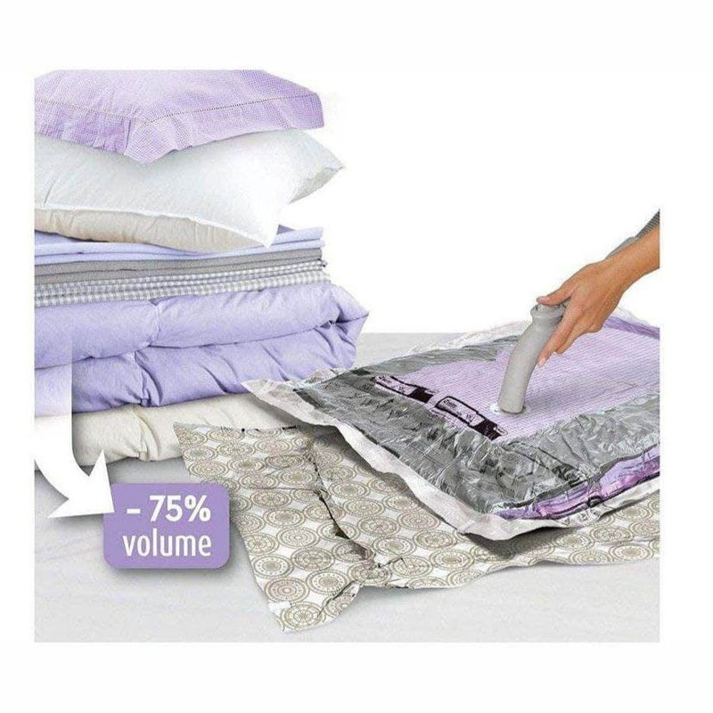 کیسه وکیوم بگ کیسه مخصوصی است که شما میتوانید با استفاده از آن حجم البسه خود را تا 75 درصد کاهش دهید. یکی از کاربردهای استفاده از کیسه کم حجم کننده لباس یا همان وکیوم بگ جلوگیری از نفوذ حشرات، بید زدگی، رطوبت، بوگرفتگی، گرد و خاک و نفوذ قارچ ها و باکتری ها به داخل البسه است. تصور کنید که قصد رفتن به سفر را دارید آیا دوست ندارید حجم لباس هایتان تا یک چهارم کاهش پیدا کند تا راحت تر در چمدان یا ساک شما جای بگیرد؟ کیسه کم حجم کننده لباس (وکیوم بگ) این کار را برای شما انجام می دهد. فقط کافیست از قسمت کناری کیسه پوشاک خود را وارد کیسه کرده و سپس بعد از بستن زیپ مخصوص با جاروبرقی اقدام به تخلیه هوای داخل کیسه نمایید. دقت کنید برای دریافت نتیجه مطلوب از تا کردن زیاد البسه داخل کیسه خودداری نمایید تا هوا بتواند در هنگام مکش به درستی خارج شود همچنین از فشردن زیاد البسه داخل یک کیسه خودداری نمایید. در هنگام تخلیه هوا حتما ابتدا جاروبرقی را خاموش کرده و سپس خرطومی جاروبرقی را از دهانه کیسه جدا کنید تا آسیبی به درب خروجی هوا وارد نشود. قبل از قرار دادن البسه داخل کیسه از خشک بودن آنها مطمئن شوید. از قرار دادن هرگونه اشیاء نوک تیز و گوشه دار داخل کیسه خودداری کنید تا در زمان تخلیه هوا با عث پارگی کیسه نشوند. پس از تخلیه کامل هوا از داخل کیسه، جارو برقی را از کیسه جدا و درب سبز رنگ کیسه را ببندید.
