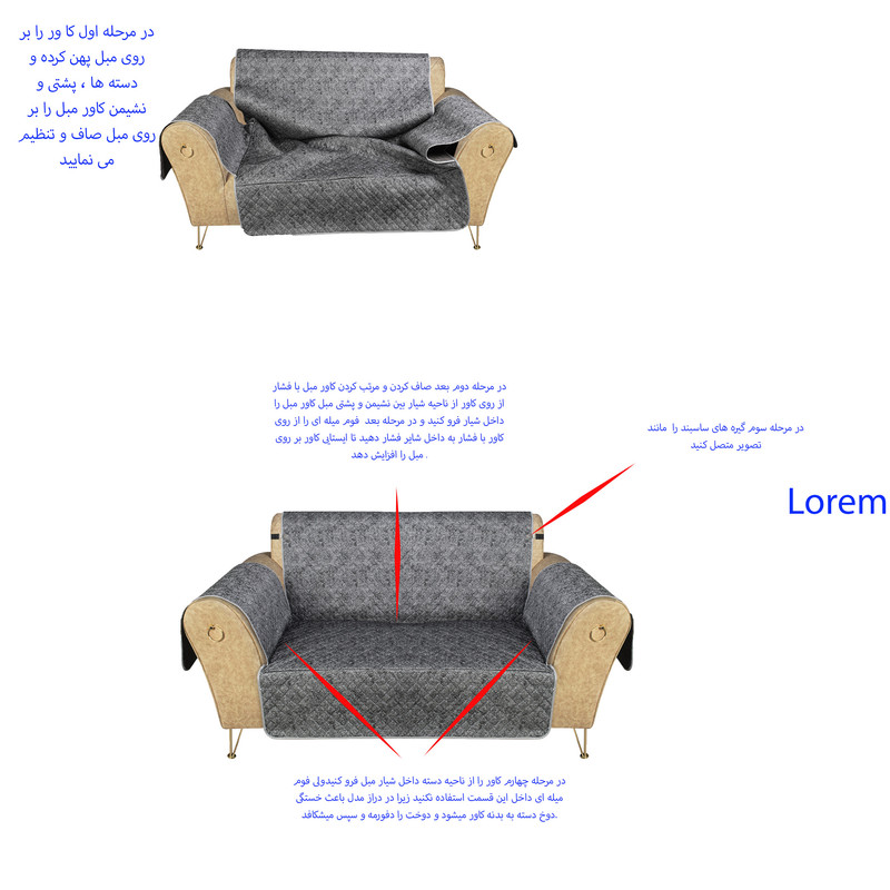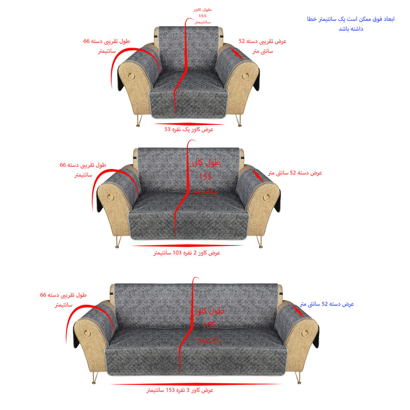 کالای فوق یک کاور مبلمان برای مبل راحتی است که جنس رویه آن پارچه رو مبلی با نخ ویسکوز و fdy و جنس وسط الیاف و سپس یک لایه پارچه بی بافت برای مقاومت در برابر عبور رطوبت و کند کردن عبور مایعات و در نهایت پارچه گردبافت قهوه ای که به عنوان پشت محصول از آن استفاده شده است. این کاور تنفس طبیعی است و ضد آب نیست، این امر سبب میشود که این کاور قابل شستشو باشد و با نشستن زیاد بر روی آن اصلا تعریق نمیکند و به پارچه مبل آسیب وارد نمیکند. دقت کنید که حتما قبل از خرید ابعاد کاور مبل را با مبل خود چک کنید حتی با اختلاف ابعاد 5 تا 8 سانتیمتری کاور با مبل شما نیز می توان با نصب درست از این کاور استفاده کرد. حتما اتمام عکسهای آلبوم تصاویر را با دقت چک کنید و توضیحات بر روی عکسها را مطالعه کنید