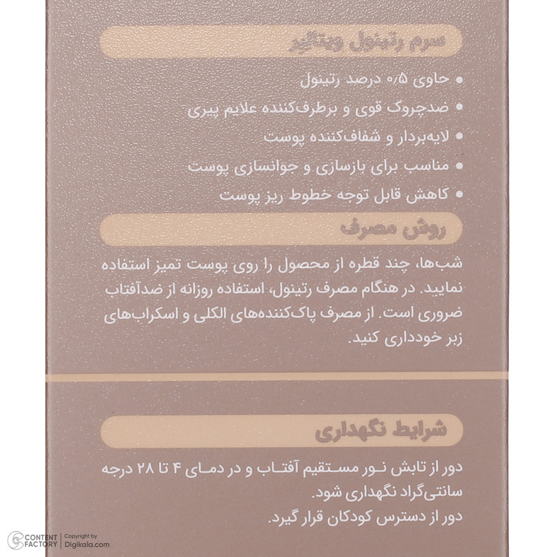 ضدچروک قوی و برطرفکننده علائم پیری حاوی 0.5 درصد رتینول خالص بازسازنده و جوانساز کاهش چشمگیر چروکهای ریز لایه بردار و شفاف کننده