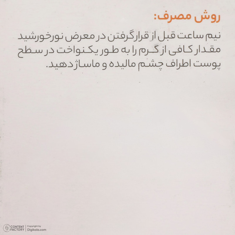 نیم ساعت قبل از قرار گرفتن در معرض نور خورشید مقدار کافی از کرم را بطور یکنواخت در سطح پوست اطراف چشم مالیده و ماساژ دهید.