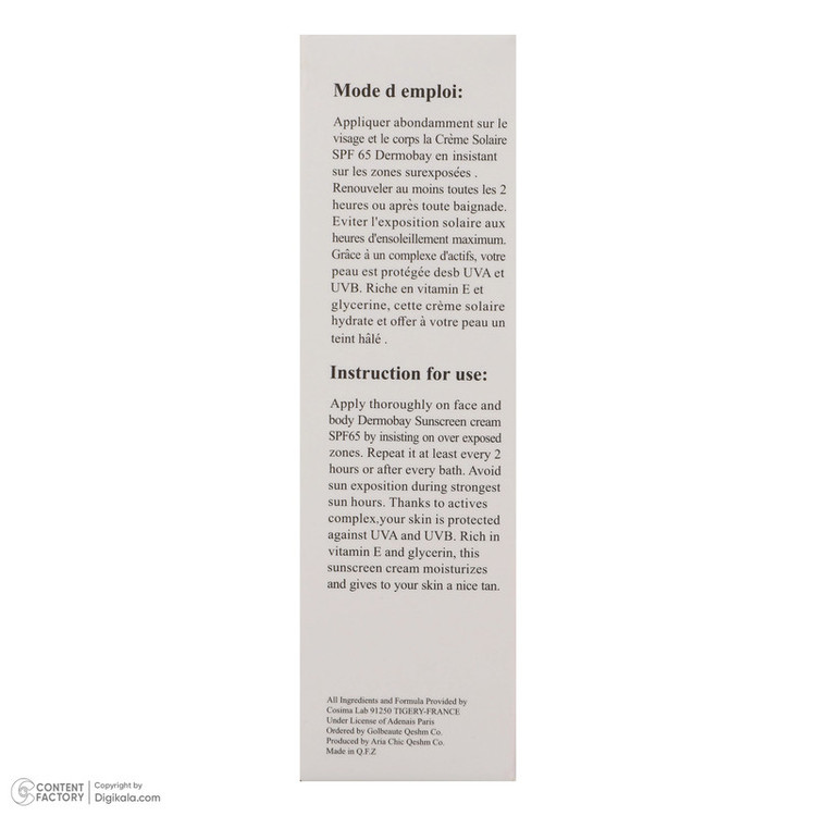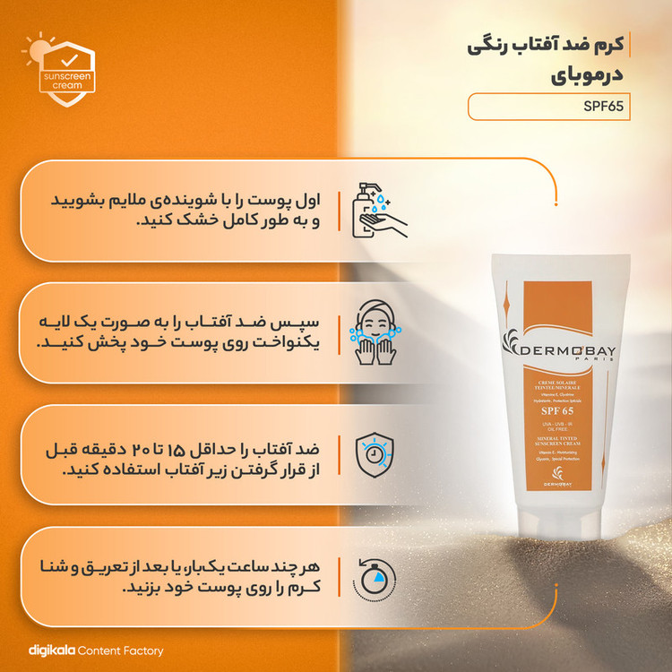 راهنمای استفاده : بیست دقیقه قبل از قرار گرفتن در معرض آفتاب کرم ضد آفتاب درموبای را استفاده نموده و هر 2 ساعت یکبار آن را تجدید نمایید.