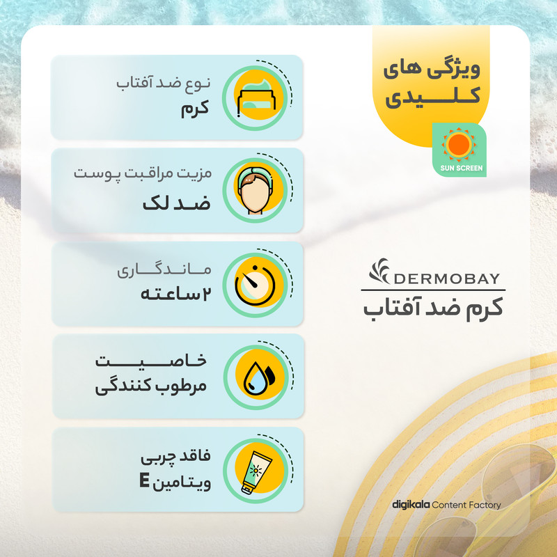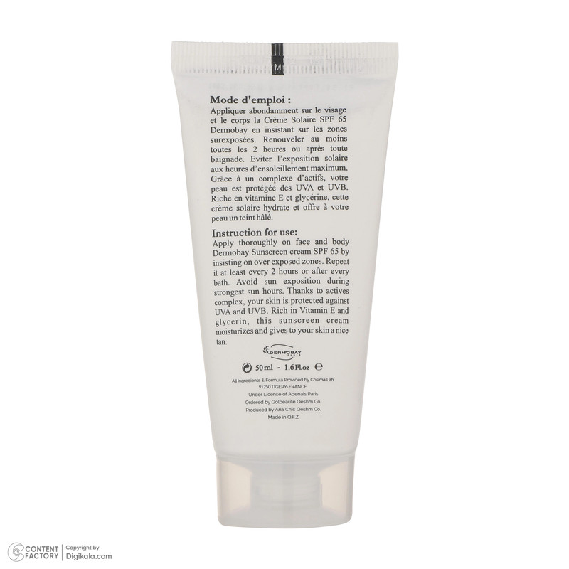 راهنمای استفاده : بیست دقیقه قبل از قرار گرفتن در معرض آفتاب کرم ضد آفتاب درموبای را استفاده نموده و هر 2 ساعت یکبار آن را تجدید نمایید.