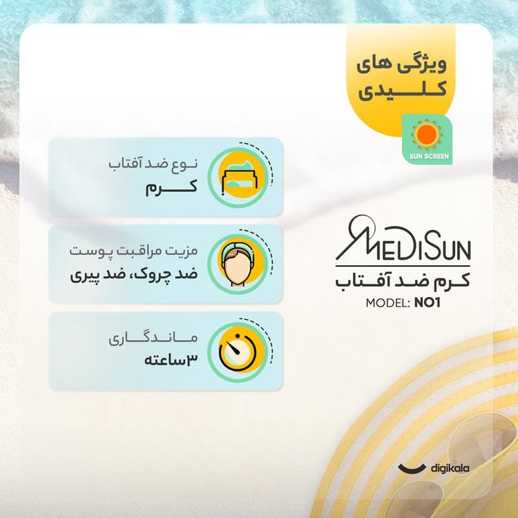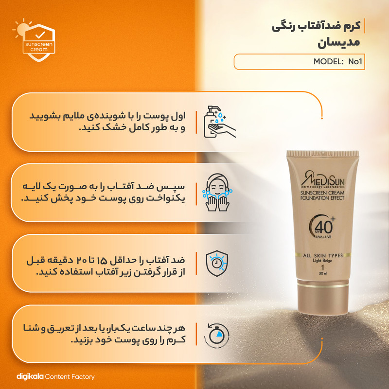 کرم ضد آفتاب رنگی مدیسان، SPF 40، مدل No1، مناسب انواع پوست با تنالیته متوسط و حجم 30 میلی‌لیتر، محافظت‌کننده در برابر اشعه‌های UVA و UVB، ضد چروک و پیری، دارای فرمولاسیون تیتانیوم دی اکساید و گلیسیرین، با ماندگاری 3 ساعته