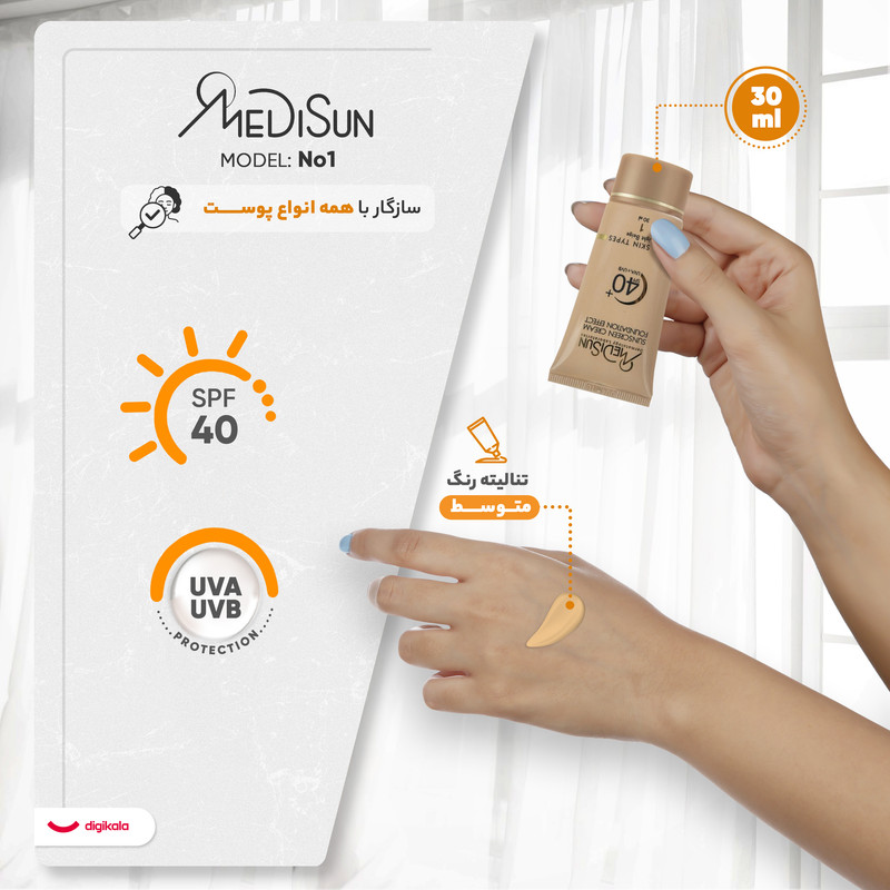 کرم ضد آفتاب رنگی مدیسان، SPF 40، مدل No1، مناسب انواع پوست با تنالیته متوسط و حجم 30 میلی‌لیتر، محافظت‌کننده در برابر اشعه‌های UVA و UVB، ضد چروک و پیری، دارای فرمولاسیون تیتانیوم دی اکساید و گلیسیرین، با ماندگاری 3 ساعته