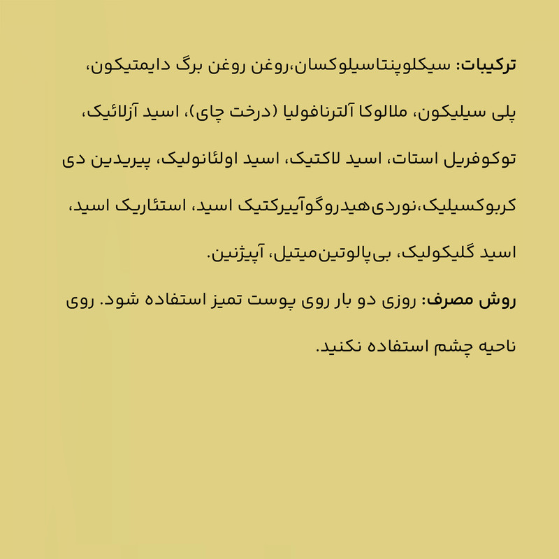 ملاحظات مصرف: این محصول تنها برای استعمال خارجی است و از بهکار بردن آن روی پوست تحریکشده یا زخمی خودداری کنید. در صورت بروز قرمزی یا سوزش، مصرف را متوقف کرده و با پزشک مشورت کنید.