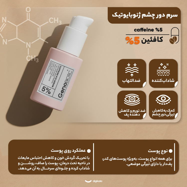 سرم دور چشم ژنوبایوتیک مدل کافئین مناسب برای انواع پوست حجم 30 میلی لیتر