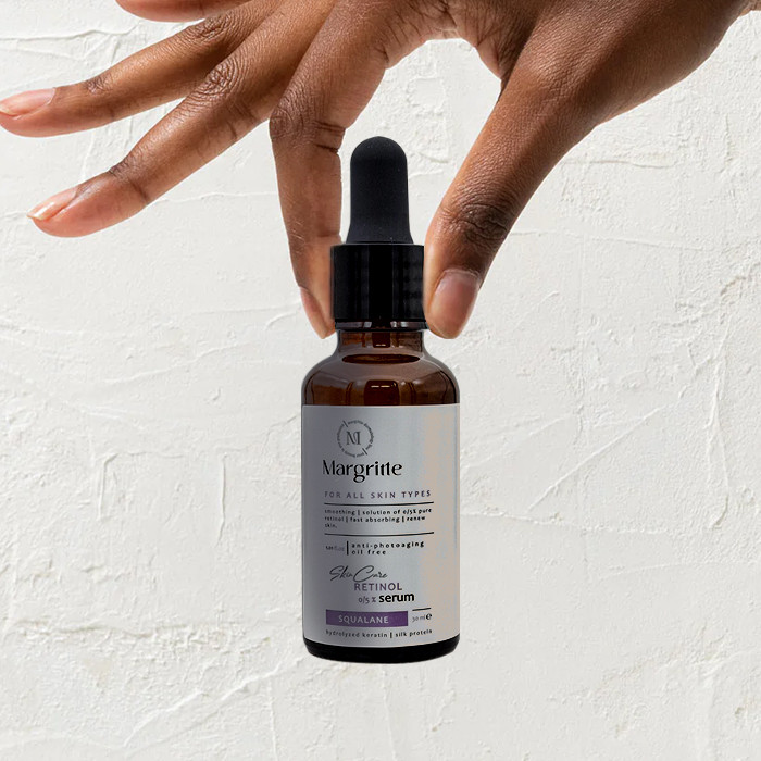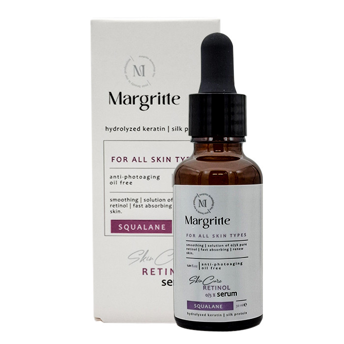 سرم ضد چروک رتینول مارگریت یک سرم ضد پیری بسیار عالی، حاوی 0.5% رتینول بوده که به خوبی چین و چروک و علائم پیری پوست را کاهش می دهد. ترکیبات این سرم به گونه ای طراحی شده که حتی حساس ترین پوست ها که به رتینول واکنش نشان می دهند نیز برای استفاده از آن هیچ منعی ندارند.